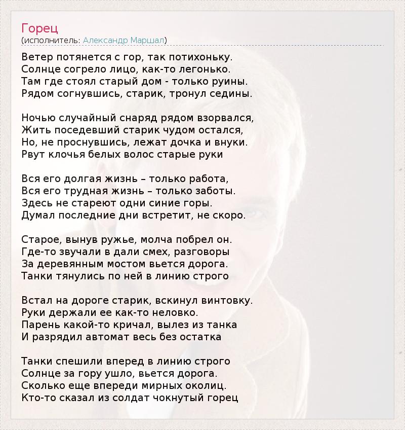Ветер потянется с гор, так потихоньку. Солнце согрело лицо, как-то легонько. Там где стоял старый дом - только руины. Рядом согнувшись, старик, тронул седины. Ночью случайный снаряд рядом взорвался, Жить поседевший старик чудом остался, Но, не проснувшись, лежат дочка и внуки. Рвут клочья белых волос старые руки Вся его долгая жизнь – только работа, Вся его трудная жизнь – только заботы. Здесь не стареют одни синие горы. Думал последние дни встретит, не скоро. Старое, вынув ружье, молча побрел он. Где-то звучали в дали смех, разговоры За деревянным мостом вьется дорога. Танки тянулись по ней в линию строго Встал на дороге старик, вскинул винтовку. Руки держали ее как-то неловко. Парень какой-то кричал, вылез из танка И разрядил автомат весь без остатка Танки спешили вперед в линию строго Солнце за гору ушло, вьется дорога. Сколько еще впереди мирных околиц. Кто-то сказал из солдат чокнутый горец