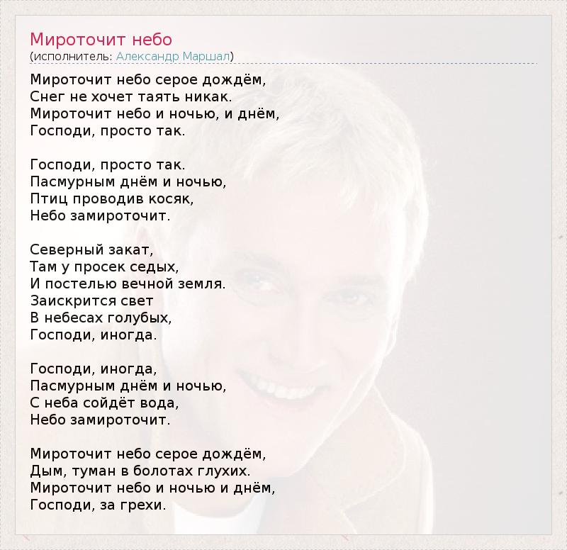 Мироточит небо серое дождём, Снег не хочет таять никак. Мироточит небо и ночью, и днём, Господи, просто так. Господи, просто так. Пасмурным днём и ночью, Птиц проводив косяк, Небо замироточит. Северный закат, Там у просек седых, И постелью вечной земля. Заискрится свет В небесах голубых, Господи, иногда. Господи, иногда, Пасмурным днём и ночью, С неба сойдёт вода, Небо замироточит. Мироточит небо серое дождём, Дым, туман в болотах глухих. Мироточит небо и ночью и днём, Господи, за грехи.