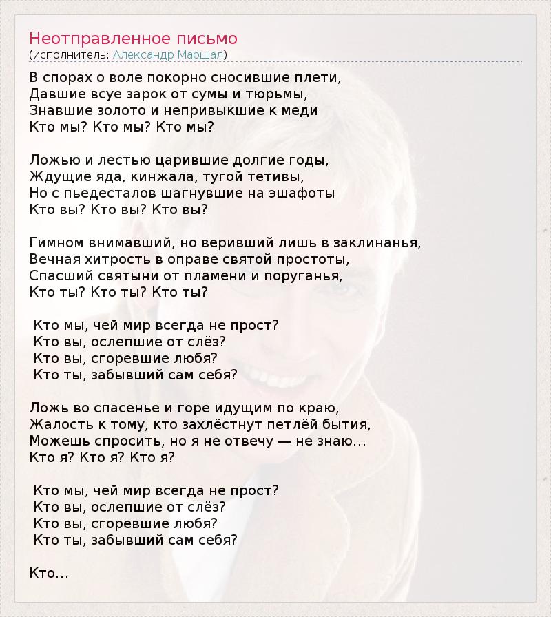 В спорах о воле покорно сносившие плети, Давшие всуе зарок от сумы и тюрьмы, Знавшие золото и непривыкшие к меди Кто мы? Кто мы? Кто мы? Ложью и лестью царившие долгие годы, Ждущие яда, кинжала, тугой тетивы, Но с пьедесталов шагнувшие на эшафоты Кто вы? Кто вы? Кто вы? Гимном внимавший, но веривший лишь в заклинанья, Вечная хитрость в оправе святой простоты, Спасший святыни от пламени и поруганья, Кто ты? Кто ты? Кто ты? Кто мы, чей мир всегда не прост? Кто вы, ослепшие от слёз? Кто вы, сгоревшие любя? Кто ты, забывший сам себя? Ложь во спасенье и горе идущим по краю, Жалость к тому, кто захлёстнут петлёй бытия, Можешь спросить, но я не отвечу — не знаю… Кто я? Кто я? Кто я? Кто мы, чей мир всегда не прост? Кто вы, ослепшие от слёз? Кто вы, сгоревшие любя? Кто ты, забывший сам себя? Кто…