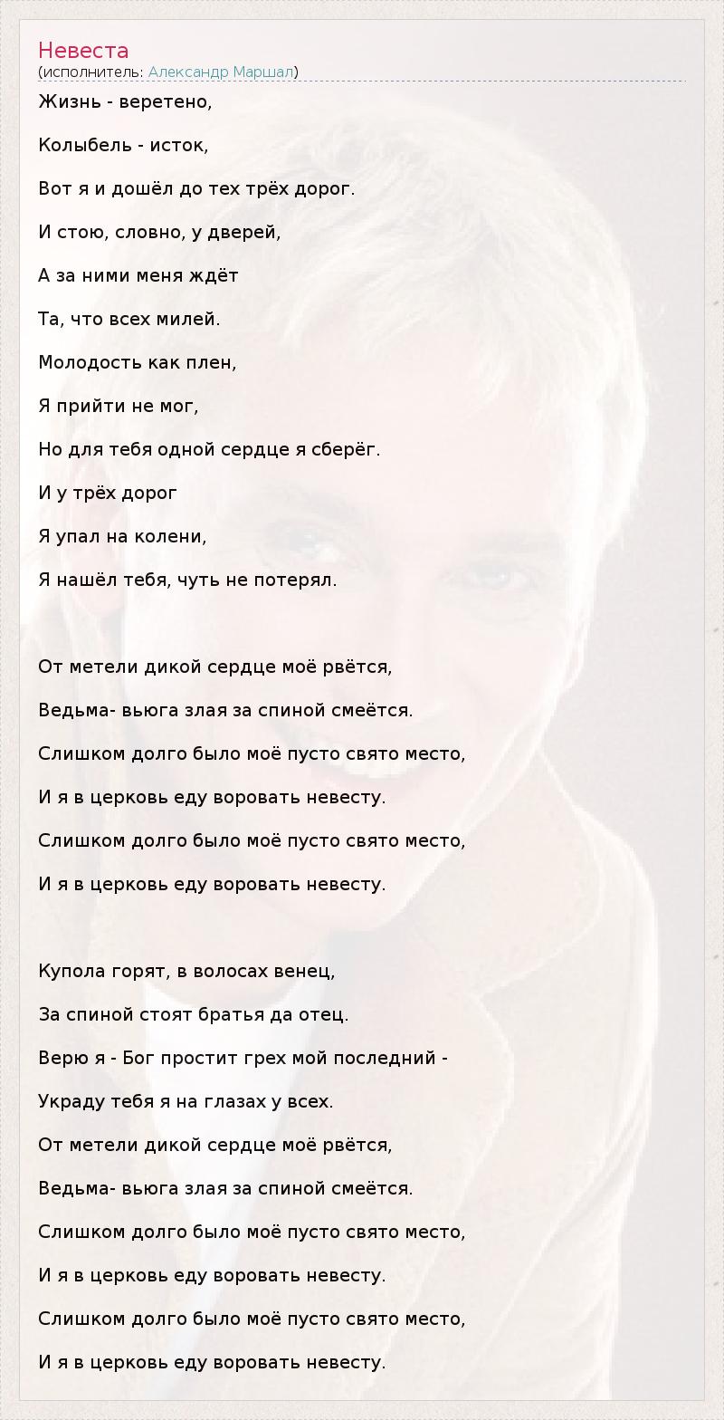 Это интересно:Александр Маршал - по паспорту Александр Витальевич Миньков - родился 7 июня 1957 г. в городе Кореновске Краснодарского края. В начале 80-х годов переехал в Москву, где вскоре начал сотрудничать с продюсером Стасом Наминым. В 1987-м году переходит в российскую рок-группу "Парк Горького", меняя на позиции вокалиста Николая Носкова, и переезжает вместе с ней в США. В конце 1998-го покидает... продолжение