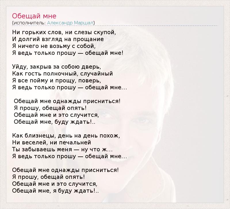 Ни горьких слов, ни слезы скупой, И долгий взгляд на прощание Я ничего не возьму с собой, Я ведь только прошу — обещай мне! Уйду, закрыв за собою дверь, Как гость полночный, случайный Я все пойму и прощу, поверь, Я ведь только прошу — обещай мне… Обещай мне однажды присниться! Я прошу, обещай опять! Обещай мне и это случится, Обещай мне, буду ждать!.. Как близнецы, день на день похож, Ни веселей, ни печальней Ты забываешь меня — ну что ж… Я ведь только прошу — обещай мне… Обещай мне однажды присниться! Я прошу, обещай опять! Обещай мне и это случится, Обещай мне, я буду ждать!..