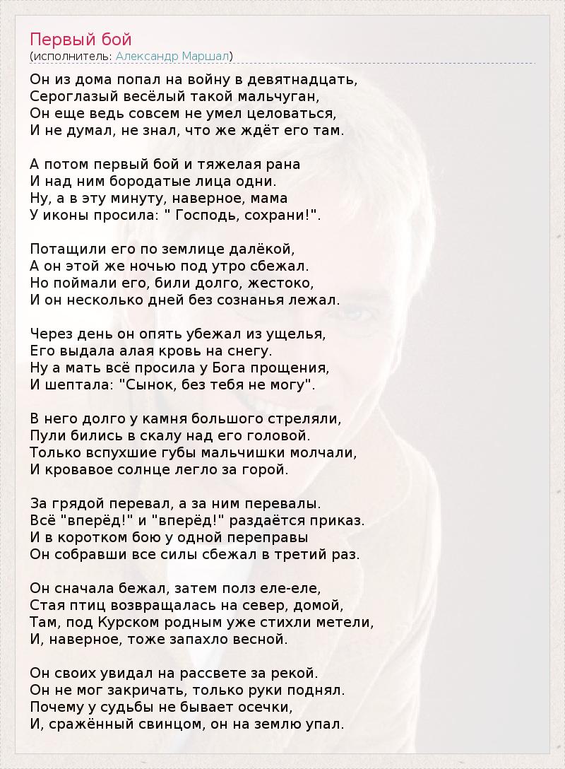 Он из дома попал на войну в девятнадцать, Сероглазый весёлый такой мальчуган, Он еще ведь совсем не умел целоваться, И не думал, не знал, что же ждёт его там. А потом первый бой и тяжелая рана И над ним бородатые лица одни. Ну, а в эту минуту, наверное, мама У иконы просила: " Господь, сохрани!". Потащили его по землице далёкой, А он этой же ночью под утро сбежал. Но поймали его, били долго, жестоко, И он несколько дней без сознанья лежал. Через день он опять убежал из ущелья, Его выдала алая кровь на снегу. Ну а мать всё просила у Бога прощения, И шептала: "Сынок, без тебя не могу". В него долго у камня большого стреляли, Пули бились в скалу над его головой. Только вспухшие губы мальчишки молчали, И кровавое солнце легло за горой. За грядой перевал, а за ним перевалы. Всё "вперёд!" и "вперёд!" раздаётся приказ. И в коротком бою у одной переправы Он собравши все силы сбежал в третий раз. Он сначала бежал, затем полз еле-еле, Стая птиц возвращалась на север, домой, Там, под Курском родным уже стихли метели, И, наверное, тоже запахло весной. Он своих увидал на рассвете за рекой. Он не мог закричать, только руки поднял. Почему у судьбы не бывает осечки, И, сражённый свинцом, он на землю упал.