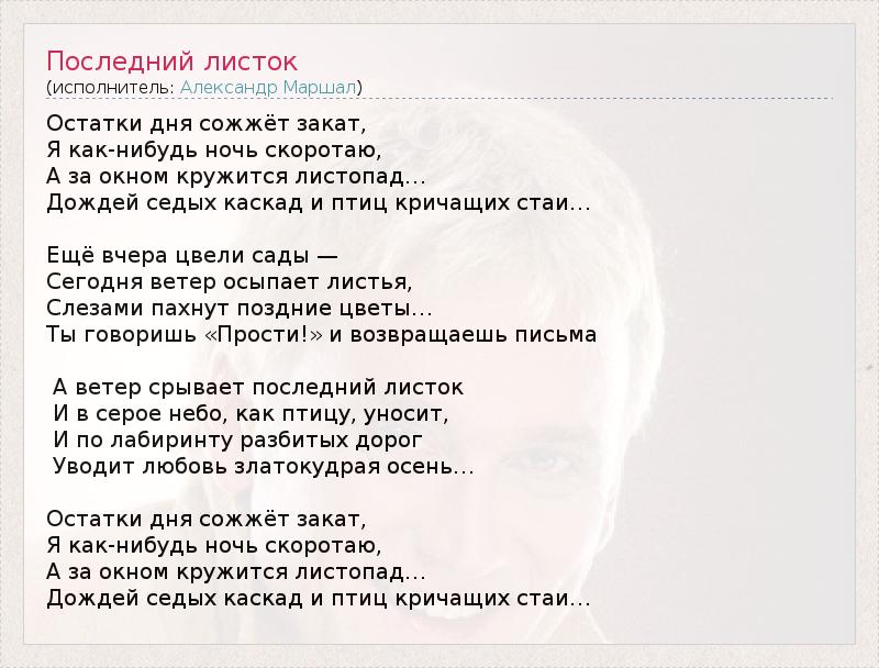 Остатки дня сожжёт закат, Я как-нибудь ночь скоротаю, А за окном кружится листопад… Дождей седых каскад и птиц кричащих стаи… Ещё вчера цвели сады — Сегодня ветер осыпает листья, Слезами пахнут поздние цветы… Ты говоришь «Прости!» и возвращаешь письма А ветер срывает последний листок И в серое небо, как птицу, уносит, И по лабиринту разбитых дорог Уводит любовь златокудрая осень… Остатки дня сожжёт закат, Я как-нибудь ночь скоротаю, А за окном кружится листопад… Дождей седых каскад и птиц кричащих стаи…