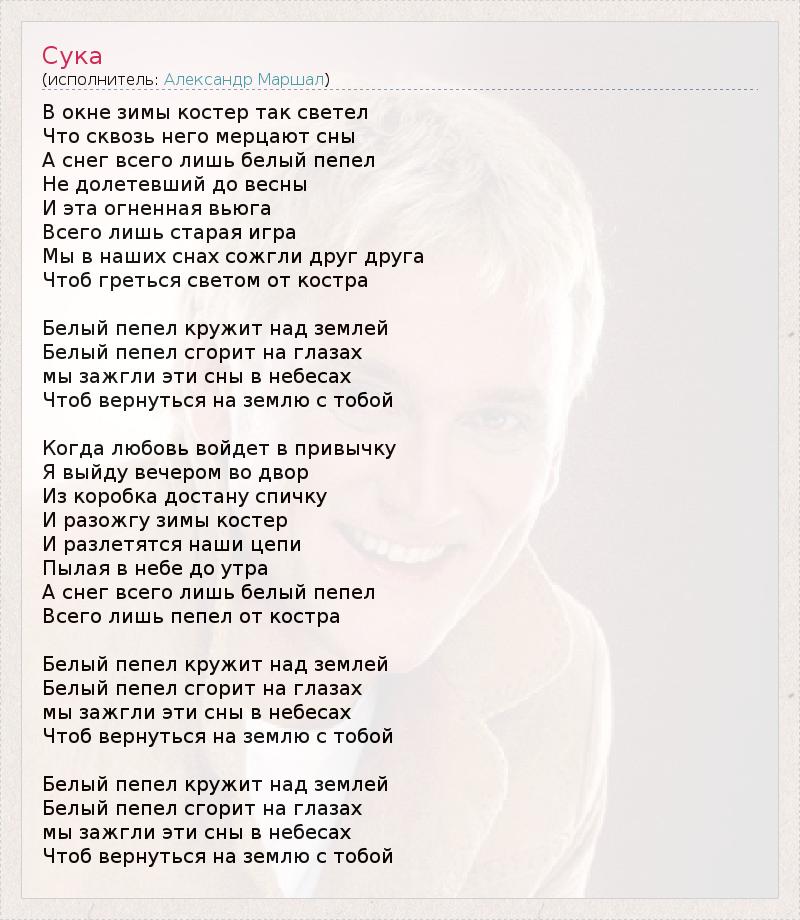 В окне зимы костер так светел Что сквозь него мерцают сны А снег всего лишь белый пепел Не долетевший до весны И эта огненная вьюга Всего лишь старая игра Мы в наших снах сожгли друг друга Чтоб греться светом от костра Белый пепел кружит над землей Белый пепел сгорит на глазах мы зажгли эти сны в небесах Чтоб вернуться на землю с тобой Когда любовь войдет в привычку Я выйду вечером во двор Из коробка достану спичку И разожгу зимы костер И разлетятся наши цепи Пылая в небе до утра А снег всего лишь белый пепел Всего лишь пепел от костра Белый пепел кружит над землей Белый пепел сгорит на глазах мы зажгли эти сны в небесах Чтоб вернуться на землю с тобой Белый пепел кружит над землей Белый пепел сгорит на глазах мы зажгли эти сны в небесах Чтоб вернуться на землю с тобой