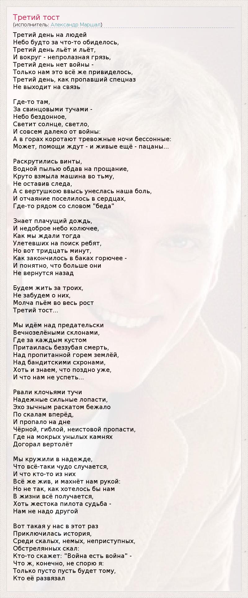 Третий день на людей Небо будто за что-то обиделось, Третий день льёт и льёт, И вокруг - непролазная грязь, Третий день нет войны - Только нам это всё же привиделось, Третий день, как пропавший спецназ Не выходит на связь Где-то там, За свинцовыми тучами - Небо бездонное, Светит солнце, светло, И совсем далеко от войны: А в горах коротают тревожные ночи бессонные: Может, помощи ждут - и живые ещё - пацаны... Раскрутились винты, Водной пылью обдав на прощание, Круто взмыла машина во тьму, Не оставив следа, А с вертушкою ввысь унеслась наша боль, И отчаяние поселилось в сердцах, Где-то рядом со словом "беда" Знает плачущий дождь, И недоброе небо колючее, Как мы ждали тогда Улетевших на поиск ребят, Но вот тридцать минут, Как закончилось в баках горючее - И понятно, что больше они Не вернутся назад Будем жить за троих, Не забудем о них, Молча пьём во весь рост Третий тост... Мы идём над предательски Вечнозелёными склонами, Где за каждым кустом Притаилась беззубая смерть, Над пропитанной горем землёй, Над бандитскими схронами, Хоть и знаем, что поздно уже, И что нам не успеть... Рвали клочьями тучи Надежные сильные лопасти, Эхо зычным раскатом бежало По скалам вперёд, И пропало на дне Чёрной, гиблой, неистовой пропасти, Где на мокрых унылых камнях Догорал вертолёт Мы кружили в надежде, Что всё-таки чудо случается, И что кто-то из них Всё же жив, и махнёт нам рукой: Но не так, как хотелось бы нам В жизни всё получается, Хоть жестока пилота судьба - Нам не надо другой Вот такая у нас в этот раз Приключилась история, Среди скалых, немых, неприступных, Обстрелянных скал: Кто-то скажет: "Война есть война" - Что ж, конечно, не спорю я: Только пусто пусть будет тому, Кто её развязал