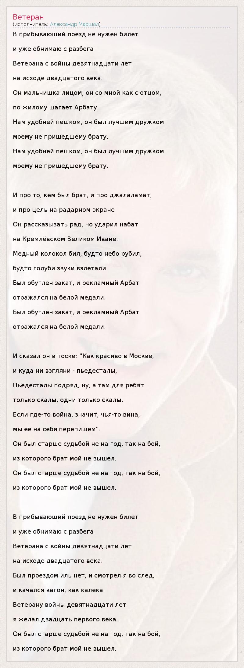 В прибывающий поезд не нужен билет и уже обнимаю с разбега Ветерана с войны девятнадцати лет на исходе двадцатого века. Он мальчишка лицом, он со мной как с отцом, по жилому шагает Арбату. Нам удобней пешком, он был лучшим дружком моему не пришедшему брату. Нам удобней пешком, он был лучшим дружком моему не пришедшему брату. И про то, кем был брат, и про джалаламат, и про цель на радарном экране Он рассказывать рад, но ударил набат на Кремлёвском Великом Иване. Медный колокол бил, будто небо рубил, будто голуби звуки взлетали. Был обуглен закат, и рекламный Арбат отражался на белой медали. Был обуглен закат, и рекламный Арбат отражался на белой медали. И сказал он в тоске: "Как красиво в Москве, и куда ни взгляни - пьедесталы, Пьедесталы подряд, ну, а там для ребят только скалы, одни только скалы. Если где-то война, значит, чья-то вина, мы её на себя перепишем". Он был старше судьбой не на год, так на бой, из которого брат мой не вышел. Он был старше судьбой не на год, так на бой, из которого брат мой не вышел. В прибывающий поезд не нужен билет и уже обнимаю с разбега Ветерана с войны девятнадцати лет на исходе двадцатого века. Был проездом иль нет, и смотрел я во след, и качался вагон, как калека. Ветерану войны девятнадцати лет я желал двадцать первого века. Он был старше судьбой не на год, так на бой, из которого брат мой не вышел.