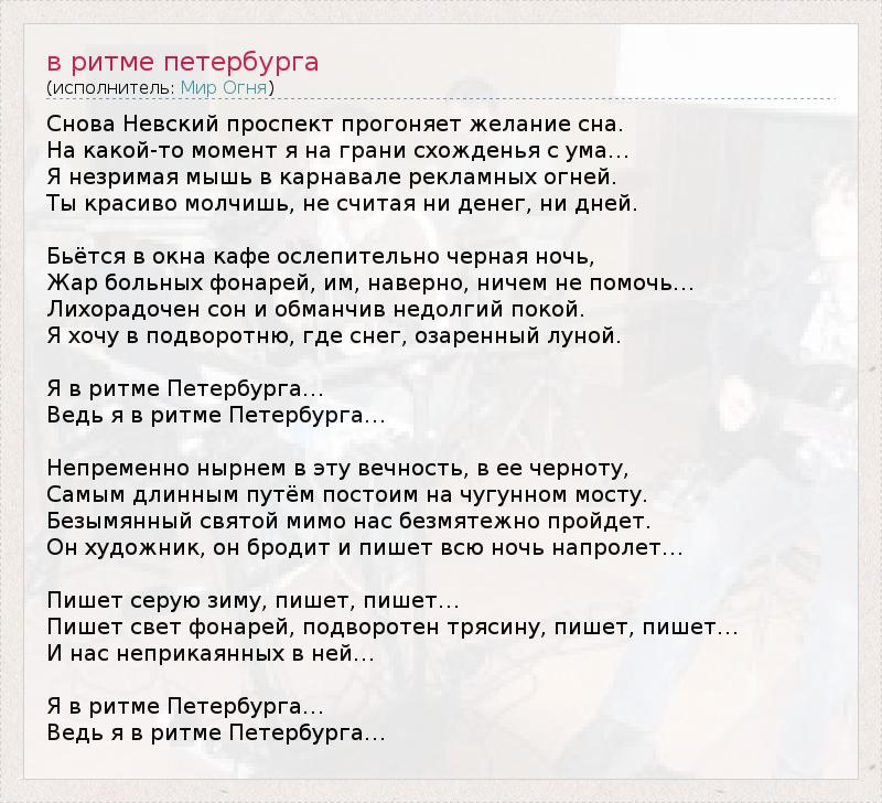 ГлавнаяИсполнителиМир Огняв ритме петербурга