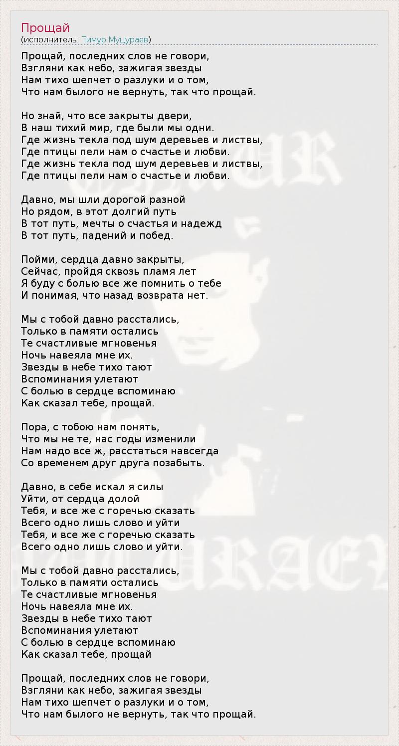 Прощай, последних слов не говори, Взгляни как небо, зажигая звезды Нам тихо шепчет о разлуки и о том, Что нам былого не вернуть, так что прощай. Но знай, что все закрыты двери, В наш тихий мир, где были мы одни. Где жизнь текла под шум деревьев и листвы, Где птицы пели нам о счастье и любви. Где жизнь текла под шум деревьев и листвы, Где птицы пели нам о счастье и любви. Давно, мы шли дорогой разной Но рядом, в этот долгий путь В тот путь, мечты о счастья и надежд В тот путь, падений и побед. Пойми, сердца давно закрыты, Сейчас, пройдя сквозь пламя лет Я буду с болью все же помнить о тебе И понимая, что назад возврата нет. Мы с тобой давно расстались, Только в памяти остались Те счастливые мгновенья Ночь навеяла мне их. Звезды в небе тихо тают Вспоминания улетают С болью в сердце вспоминаю Как сказал тебе, прощай. Пора, с тобою нам понять, Что мы не те, нас годы изменили Нам надо все ж, расстаться навсегда Со временем друг друга позабыть. Давно, в себе искал я силы Уйти, от сердца долой Тебя, и все же с горечью сказать Всего одно лишь слово и уйти Тебя, и все же с горечью сказать Всего одно лишь слово и уйти. Мы с тобой давно расстались, Только в памяти остались Те счастливые мгновенья Ночь навеяла мне их. Звезды в небе тихо тают Вспоминания улетают С болью в сердце вспоминаю Как сказал тебе, прощай Прощай, последних слов не говори, Взгляни как небо, зажигая звезды Нам тихо шепчет о разлуки и о том, Что нам былого не вернуть, так что прощай.