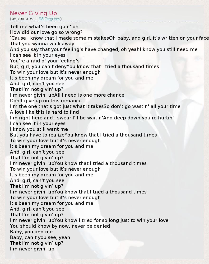 Tell me what's been goin' on How did our love go so wrong? 'Cause I know that I made some mistakesOh baby, and girl, it's written on your face That you wanna walk away And you say that your feeling's have changed, oh yeahI know you still need me I can see it in your eyes You're afraid of your feeling's But, girl, you can't denyYou know that I tried a thousand times To win your love but it's never enough It's been my dream for you and me And, girl, can't you see That I'm not givin' up? I'm never givin' upAll I need is one more chance Don't give up on this romance I'm the one that's got just what it takesSo don't go wastin' all your time A love like this is hard to find I'm right here and I swear I'll be waitin'And deep down you're hurtin' I can see it in your eyes I know you still want me But you have to realizeYou know that I tried a thousand times To win your love but it's never enough It's been my dream for you and me And, girl, can't you see That I'm not givin' up? I'm never givin' upYou know that I tried a thousand times To win your love but it's never enough It's been my dream for you and me And, girl, can't you see That I'm not givin' up? I'm never givin' upYou know that I tried a thousand times To win your love but it's never enough It's been my dream for you and me And, girl, can't you see That I'm not givin' up? I'm never givin' upYou know I tried for so long just to win your love You should know by now, never be denied Baby, you and me Baby, can't you see, yeah That I'm not givin' up? I'm never givin' up