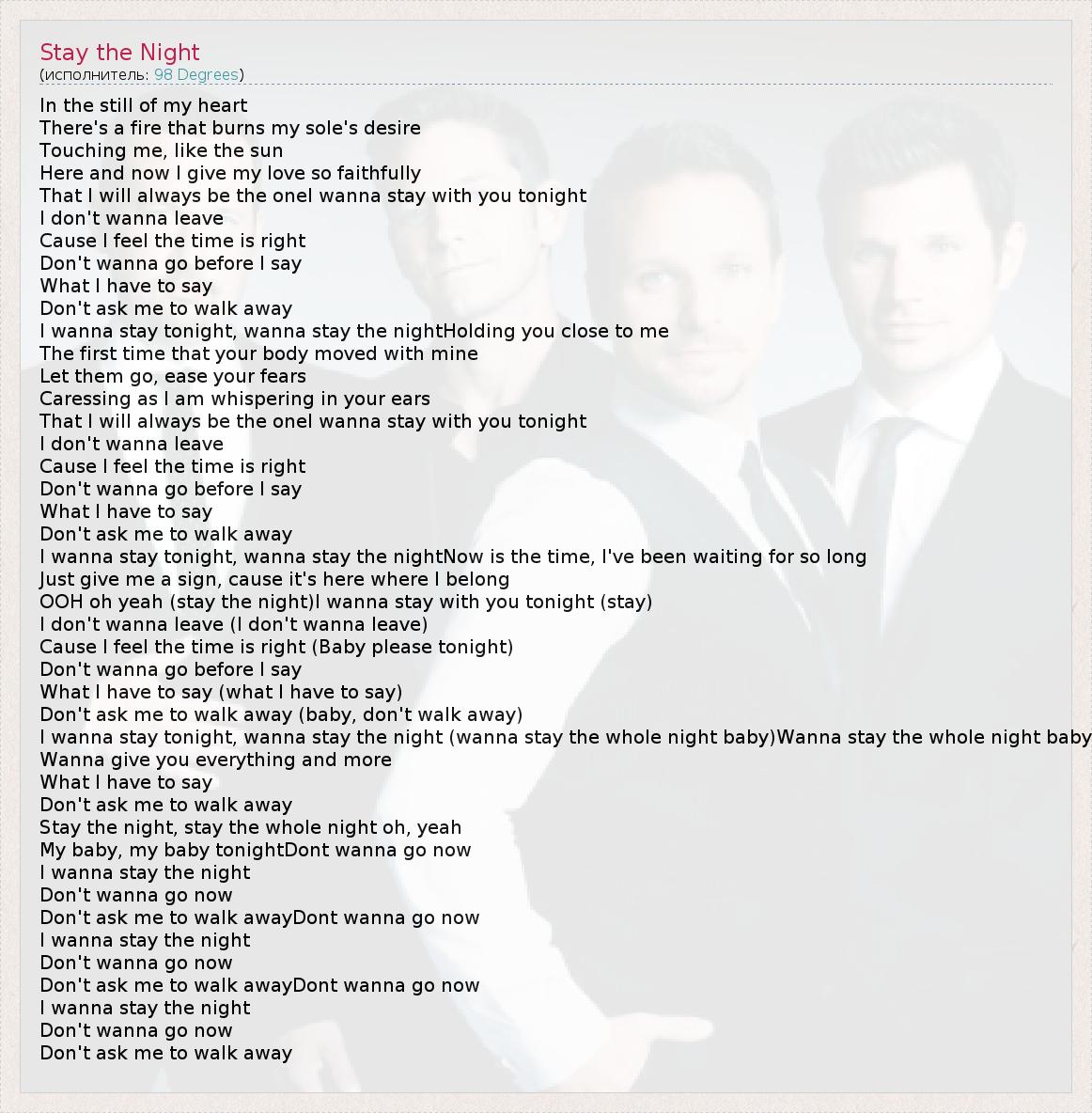 In the still of my heart There's a fire that burns my sole's desire Touching me, like the sun Here and now I give my love so faithfully That I will always be the oneI wanna stay with you tonight I don't wanna leave Cause I feel the time is right Don't wanna go before I say What I have to say Don't ask me to walk away I wanna stay tonight, wanna stay the nightHolding you close to me The first time that your body moved with mine Let them go, ease your fears Caressing as I am whispering in your ears That I will always be the oneI wanna stay with you tonight I don't wanna leave Cause I feel the time is right Don't wanna go before I say What I have to say Don't ask me to walk away I wanna stay tonight, wanna stay the nightNow is the time, I've been waiting for so long Just give me a sign, cause it's here where I belong OOH oh yeah (stay the night)I wanna stay with you tonight (stay) I don't wanna leave (I don't wanna leave) Cause I feel the time is right (Baby please tonight) Don't wanna go before I say What I have to say (what I have to say) Don't ask me to walk away (baby, don't walk away) I wanna stay tonight, wanna stay the night (wanna stay the whole night baby)Wanna stay the whole night baby Wanna give you everything and more What I have to say Don't ask me to walk away Stay the night, stay the whole night oh, yeah My baby, my baby tonightDont wanna go now I wanna stay the night Don't wanna go now Don't ask me to walk awayDont wanna go now I wanna stay the night Don't wanna go now Don't ask me to walk awayDont wanna go now I wanna stay the night Don't wanna go now Don't ask me to walk away