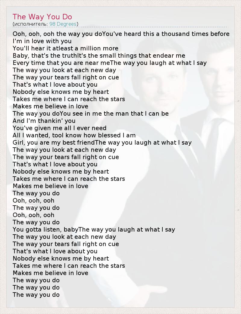 Ooh, ooh, ooh the way you doYou've heard this a thousand times before I'm in love with you You'll hear it atleast a million more Baby, that's the truthIt's the small things that endear me Every time that you are near meThe way you laugh at what I say The way you look at each new day The way your tears fall right on cue That's what I love about you Nobody else knows me by heart Takes me where I can reach the stars Makes me believe in love The way you doYou see in me the man that I can be And I'm thankin' you You've given me all I ever need All I wanted, tooI know how blessed I am Girl, you are my best friendThe way you laugh at what I say The way you look at each new day The way your tears fall right on cue That's what I love about you Nobody else knows me by heart Takes me where I can reach the stars Makes me believe in love The way you do Ooh, ooh, ooh The way you do Ooh, ooh, ooh The way you do You gotta listen, babyThe way you laugh at what I say The way you look at each new day The way your tears fall right on cue That's what I love about you Nobody else knows me by heart Takes me where I can reach the stars Makes me believe in love The way you do The way you do The way you do