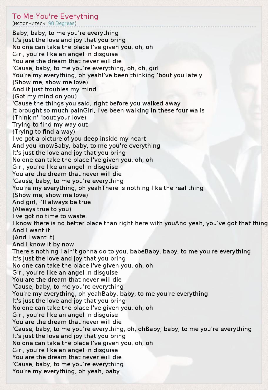 Baby, baby, to me you're everything It's just the love and joy that you bring No one can take the place I've given you, oh, oh Girl, you're like an angel in disguise You are the dream that never will die 'Cause, baby, to me you're everything, oh, oh, girl You're my everything, oh yeahI've been thinking 'bout you lately (Show me, show me love) And it just troubles my mind (Got my mind on you) 'Cause the things you said, right before you walked away It brought so much painGirl, I've been walking in these four walls (Thinkin' 'bout your love) Trying to find my way out (Trying to find a way) I've got a picture of you deep inside my heart And you knowBaby, baby, to me you're everything It's just the love and joy that you bring No one can take the place I've given you, oh, oh Girl, you're like an angel in disguise You are the dream that never will die 'Cause, baby, to me you're everything You're my everything, oh yeahThere is nothing like the real thing (Show me, show me love) And girl, I'll always be true (Always true to you) I've got no time to waste I know there is no better place than right here with youAnd yeah, you've got that thing And I want it (And I want it) And I know it by now There's nothing I ain't gonna do to you, babeBaby, baby, to me you're everything It's just the love and joy that you bring No one can take the place I've given you, oh, oh Girl, you're like an angel in disguise You are the dream that never will die 'Cause, baby, to me you're everything You're my everything, oh yeahBaby, baby, to me you're everything It's just the love and joy that you bring No one can take the place I've given you, oh, oh Girl, you're like an angel in disguise You are the dream that never will die 'Cause, baby, to me you're everything, oh, ohBaby, baby, to me you're everything It's just the love and joy that you bring No one can take the place I've given you, oh, oh Girl, you're like an angel in disguise You are the dream that never will die 'Cause, baby, to me you're everything You're my everything, oh yeah, baby