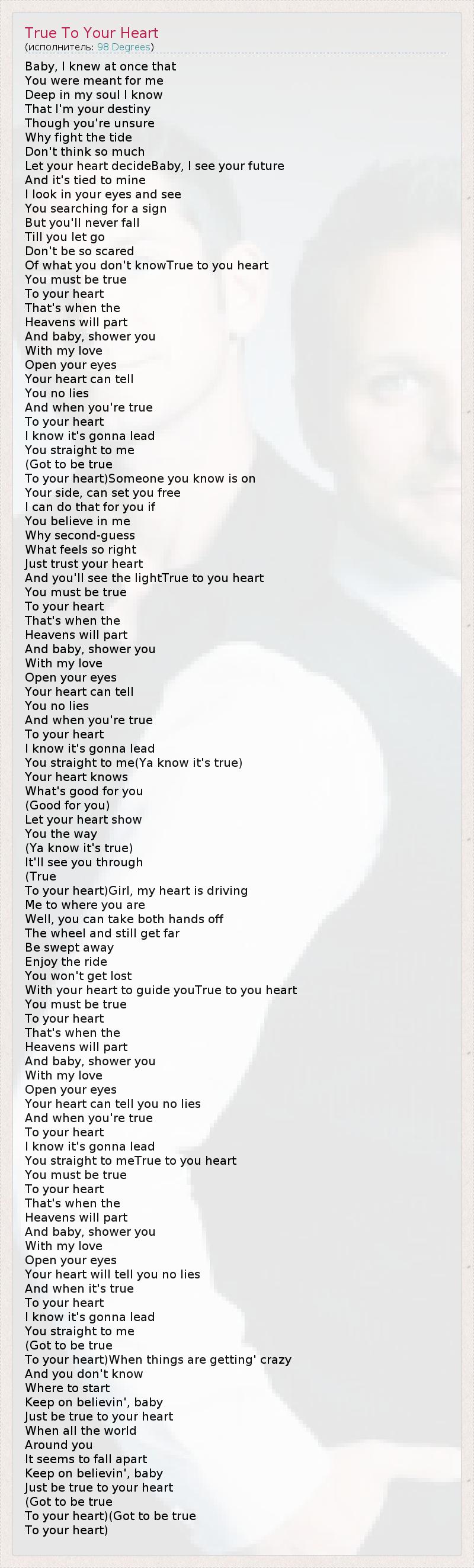 Baby, I knew at once that You were meant for me Deep in my soul I know That I'm your destiny Though you're unsure Why fight the tide Don't think so much Let your heart decideBaby, I see your future And it's tied to mine I look in your eyes and see You searching for a sign But you'll never fall Till you let go Don't be so scared Of what you don't knowTrue to you heart You must be true To your heart That's when the Heavens will part And baby, shower you With my love Open your eyes Your heart can tell You no lies And when you're true To your heart I know it's gonna lead You straight to me (Got to be true To your heart)Someone you know is on Your side, can set you free I can do that for you if You believe in me Why second-guess What feels so right Just trust your heart And you'll see the lightTrue to you heart You must be true To your heart That's when the Heavens will part And baby, shower you With my love Open your eyes Your heart can tell You no lies And when you're true To your heart I know it's gonna lead You straight to me(Ya know it's true) Your heart knows What's good for you (Good for you) Let your heart show You the way (Ya know it's true) It'll see you through (True To your heart)Girl, my heart is driving Me to where you are Well, you can take both hands off The wheel and still get far Be swept away Enjoy the ride You won't get lost With your heart to guide youTrue to you heart You must be true To your heart That's when the Heavens will part And baby, shower you With my love Open your eyes Your heart can tell you no lies And when you're true To your heart I know it's gonna lead You straight to meTrue to you heart You must be true To your heart That's when the Heavens will part And baby, shower you With my love Open your eyes Your heart will tell you no lies And when it's true To your heart I know it's gonna lead You straight to me (Got to be true To your heart)When things are getting' crazy And you don't know Where to start Keep on believin', baby Just be true to your heart When all the world Around you It seems to fall apart Keep on believin', baby Just be true to your heart (Got to be true To your heart)(Got to be true To your heart)