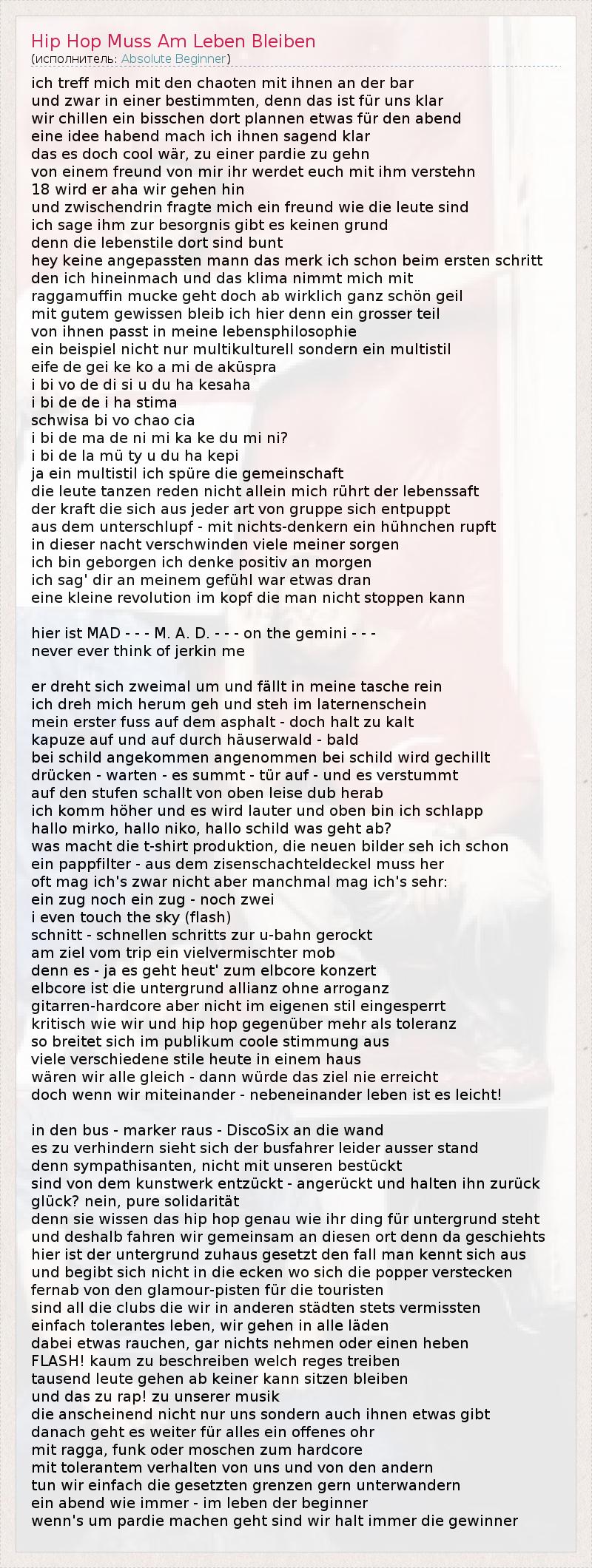 А как ты думаешь, о чем песня "Hip Hop Muss Am Leben Bleiben" ?