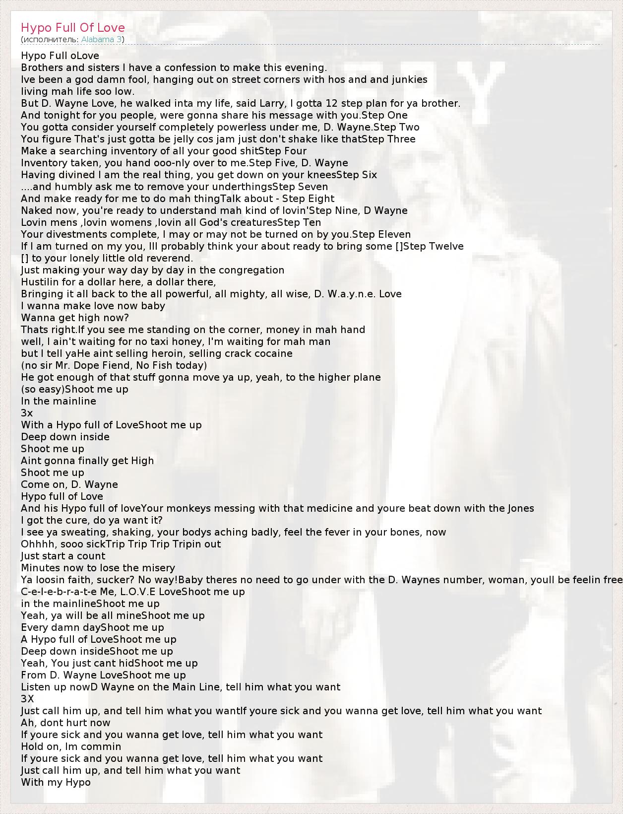 Hypo Full oLove Brothers and sisters I have a confession to make this evening. Ive been a god damn fool, hanging out on street corners with hos and and junkies living mah life soo low. But D. Wayne Love, he walked inta my life, said Larry, I gotta 12 step plan for ya brother. And tonight for you people, were gonna share his message with you.Step One You gotta consider yourself completely powerless under me, D. Wayne.Step Two You figure That's just gotta be jelly cos jam just don't shake like thatStep Three Make a searching inventory of all your good shitStep Four Inventory taken, you hand ooo-nly over to me.Step Five, D. Wayne Having divined I am the real thing, you get down on your kneesStep Six ....and humbly ask me to remove your underthingsStep Seven And make ready for me to do mah thingTalk about - Step Eight Naked now, you're ready to understand mah kind of lovin'Step Nine, D Wayne Lovin mens ,lovin womens ,lovin all God's creaturesStep Ten Your divestments complete, I may or may not be turned on by you.Step Eleven If I am turned on my you, Ill probably think your about ready to bring some []Step Twelve [] to your lonely little old reverend. Just making your way day by day in the congregation Hustilin for a dollar here, a dollar there, Bringing it all back to the all powerful, all mighty, all wise, D. W.a.y.n.e. Love I wanna make love now baby Wanna get high now? Thats right.If you see me standing on the corner, money in mah hand well, I ain't waiting for no taxi honey, I'm waiting for mah man but I tell yaHe aint selling heroin, selling crack cocaine (no sir Mr. Dope Fiend, No Fish today) He got enough of that stuff gonna move ya up, yeah, to the higher plane (so easy)Shoot me up In the mainline 3x With a Hypo full of LoveShoot me up Deep down inside Shoot me up Aint gonna finally get High Shoot me up Come on, D. Wayne Hypo full of Love And his Hypo full of loveYour monkeys messing with that medicine and youre beat down with the Jones I got the cure, do ya want it? I see ya sweating, shaking, your bodys aching badly, feel the fever in your bones, now Ohhhh, sooo sickTrip Trip Trip Tripin out Just start a count Minutes now to lose the misery Ya loosin faith, sucker? No way!Baby theres no need to go under with the D. Waynes number, woman, youll be feelin free C-e-l-e-b-r-a-t-e Me, L.O.V.E LoveShoot me up in the mainlineShoot me up Yeah, ya will be all mineShoot me up Every damn dayShoot me up A Hypo full of LoveShoot me up Deep down insideShoot me up Yeah, You just cant hidShoot me up From D. Wayne LoveShoot me up Listen up nowD Wayne on the Main Line, tell him what you want 3X Just call him up, and tell him what you wantIf youre sick and you wanna get love, tell him what you want Ah, dont hurt now If youre sick and you wanna get love, tell him what you want Hold on, Im commin If youre sick and you wanna get love, tell him what you want Just call him up, and tell him what you want With my Hypo
