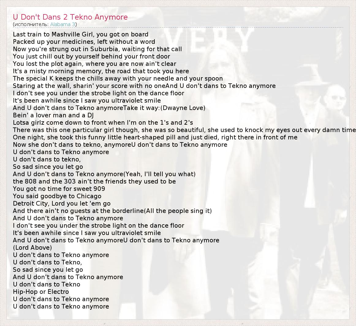 Last train to Mashville Girl, you got on board Packed up your medicines, left without a word Now you're strung out in Suburbia, waiting for that call You just chill out by yourself behind your front door You lost the plot again, where you are now ain't clear It's a misty morning memory, the road that took you here The special K keeps the chills away with your needle and your spoon Staring at the wall, sharin' your score with no oneAnd U don't dans to Tekno anymore I don't see you under the strobe light on the dance floor It's been awhile since I saw you ultraviolet smile And U don't dans to Tekno anymoreTake it way:(Dwayne Love) Bein' a lover man and a DJ Lotsa girlz come down to front when I'm on the 1's and 2's There was this one particular girl though, she was so beautiful, she used to knock my eyes out every damn time One night, she took this funny little heart-shaped pill and just died, right there in front of me Now she don't dans to tekno, anymoreU don't dans to Tekno anymore U don't dans to Tekno anymore U don't dans to tekno, So sad since you let go And U don't dans to Tekno anymore(Yeah, I'll tell you what) the 808 and the 303 ain't the friends they used to be You got no time for sweet 909 You said goodbye to Chicago Detroit City, Lord you let 'em go And there ain't no guests at the borderline(All the people sing it) And U don't dans to Tekno anymore I don't see you under the strobe light on the dance floor It's been awhile since I saw you ultraviolet smile And U don't dans to Tekno anymoreU don't dans to Tekno anymore (Lord Above) U don't dans to Tekno anymore U don't dans to Tekno, So sad since you let go And U don't dans to Tekno anymore U don't dans to Tekno Hip-Hop or Electro U don't dans to Tekno anymore U don't dans to Tekno anymore