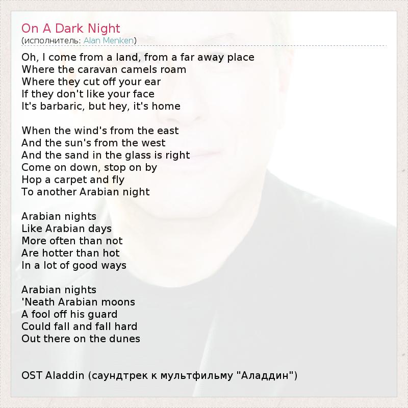 Oh, I come from a land, from a far away place Where the caravan camels roam Where they cut off your ear If they don't like your face It's barbaric, but hey, it's home When the wind's from the east And the sun's from the west And the sand in the glass is right Come on down, stop on by Hop a carpet and fly To another Arabian night Arabian nights Like Arabian days More often than not Are hotter than hot In a lot of good ways Arabian nights 'Neath Arabian moons A fool off his guard Could fall and fall hard Out there on the dunes OST Aladdin (саундтрек к мультфильму "Аладдин")