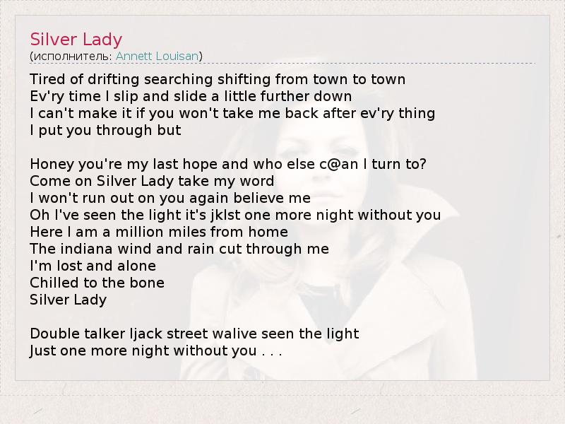 А как ты думаешь, о чем песня "Silver Lady" ?