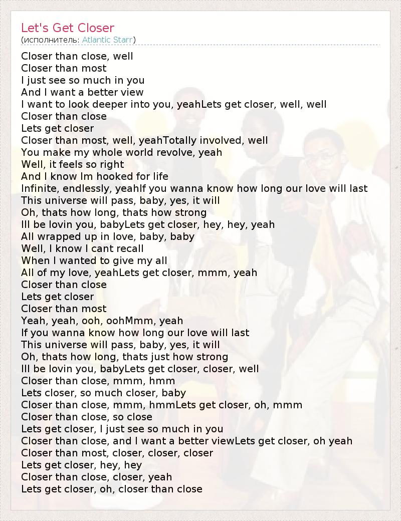 Closer than close, well Closer than most I just see so much in you And I want a better view I want to look deeper into you, yeahLets get closer, well, well Closer than close Lets get closer Closer than most, well, yeahTotally involved, well You make my whole world revolve, yeah Well, it feels so right And I know Im hooked for life Infinite, endlessly, yeahIf you wanna know how long our love will last This universe will pass, baby, yes, it will Oh, thats how long, thats how strong Ill be lovin you, babyLets get closer, hey, hey, yeah All wrapped up in love, baby, baby Well, I know I cant recall When I wanted to give my all All of my love, yeahLets get closer, mmm, yeah Closer than close Lets get closer Closer than most Yeah, yeah, ooh, oohMmm, yeah If you wanna know how long our love will last This universe will pass, baby, yes, it will Oh, thats how long, thats just how strong Ill be lovin you, babyLets get closer, closer, well Closer than close, mmm, hmm Lets closer, so much closer, baby Closer than close, mmm, hmmLets get closer, oh, mmm Closer than close, so close Lets get closer, I just see so much in you Closer than close, and I want a better viewLets get closer, oh yeah Closer than most, closer, closer, closer Lets get closer, hey, hey Closer than close, closer, yeah Lets get closer, oh, closer than close