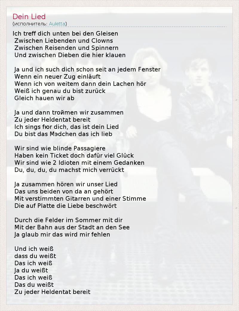 Ich treff dich unten bei den Gleisen Zwischen Liebenden und Clowns Zwischen Reisenden und Spinnern Und zwischen Dieben die hier klauen Ja und ich such dich schon seit an jedem Fenster Wenn ein neuer Zug einläuft Wenn ich von weitem dann dein Lachen hör Weiß ich genau du bist zurück Gleich hauen wir ab Ja und dann trойmen wir zusammen Zu jeder Heldentat bereit Ich sings fюr dich, das ist dein Lied Du bist das Mэdchen das ich lieb Wir sind wie blinde Passagiere Haben kein Ticket doch dafür viel Glück Wir sind wie 2 Idioten mit einem Gedanken Du, du, du, du machst mich verrückt Ja zusammen hören wir unser Lied Das uns beiden von da an gehört Mit verstimmten Gitarren und einer Stimme Die auf Platte die Liebe beschwört Durch die Felder im Sommer mit dir Mit der Bahn aus der Stadt an den See Ja glaub mir das wird mir fehlen Und ich weiß dass du weißt Das ich weiß Ja du weißt Das ich weiß Das du weißt Zu jeder Heldentat bereit