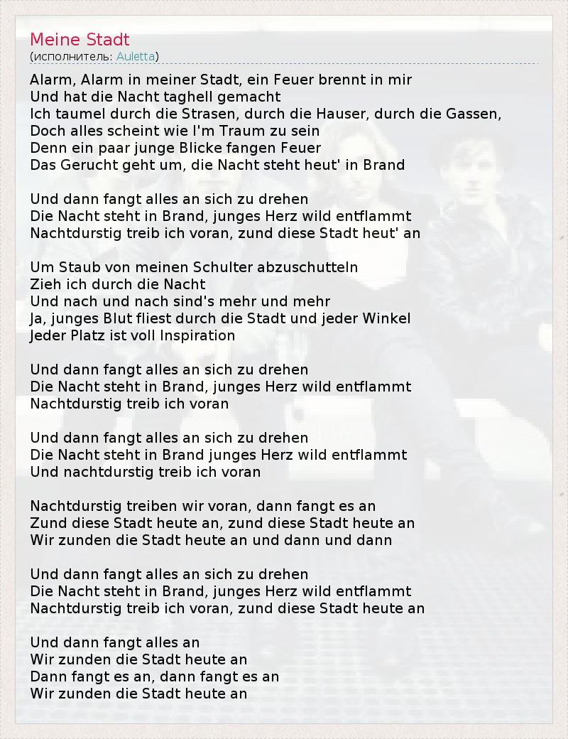 Alarm, Alarm in meiner Stadt, ein Feuer brennt in mir Und hat die Nacht taghell gemacht Ich taumel durch die Strasen, durch die Hauser, durch die Gassen, Doch alles scheint wie I'm Traum zu sein Denn ein paar junge Blicke fangen Feuer Das Gerucht geht um, die Nacht steht heut' in Brand Und dann fangt alles an sich zu drehen Die Nacht steht in Brand, junges Herz wild entflammt Nachtdurstig treib ich voran, zund diese Stadt heut' an Um Staub von meinen Schulter abzuschutteln Zieh ich durch die Nacht Und nach und nach sind's mehr und mehr Ja, junges Blut fliest durch die Stadt und jeder Winkel Jeder Platz ist voll Inspiration Und dann fangt alles an sich zu drehen Die Nacht steht in Brand, junges Herz wild entflammt Nachtdurstig treib ich voran Und dann fangt alles an sich zu drehen Die Nacht steht in Brand junges Herz wild entflammt Und nachtdurstig treib ich voran Nachtdurstig treiben wir voran, dann fangt es an Zund diese Stadt heute an, zund diese Stadt heute an Wir zunden die Stadt heute an und dann und dann Und dann fangt alles an sich zu drehen Die Nacht steht in Brand, junges Herz wild entflammt Nachtdurstig treib ich voran, zund diese Stadt heute an Und dann fangt alles an Wir zunden die Stadt heute an Dann fangt es an, dann fangt es an Wir zunden die Stadt heute an