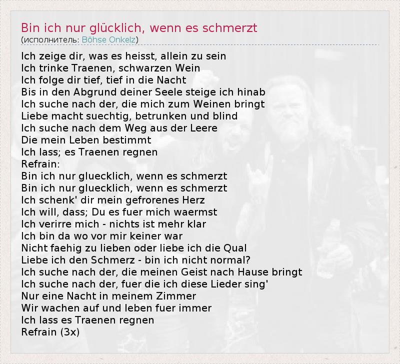 Ich zeige dir, was es heisst, allein zu sein Ich trinke Traenen, schwarzen Wein Ich folge dir tief, tief in die Nacht Bis in den Abgrund deiner Seele steige ich hinab Ich suche nach der, die mich zum Weinen bringt Liebe macht suechtig, betrunken und blind Ich suche nach dem Weg aus der Leere Die mein Leben bestimmt Ich lass; es Traenen regnen Refrain: Bin ich nur gluecklich, wenn es schmerzt Bin ich nur gluecklich, wenn es schmerzt Ich schenk' dir mein gefrorenes Herz Ich will, dass; Du es fuer mich waermst Ich verirre mich - nichts ist mehr klar Ich bin da wo vor mir keiner war Nicht faehig zu lieben oder liebe ich die Qual Liebe ich den Schmerz - bin ich nicht normal? Ich suche nach der, die meinen Geist nach Hause bringt Ich suche nach der, fuer die ich diese Lieder sing' Nur eine Nacht in meinem Zimmer Wir wachen auf und leben fuer immer Ich lass es Traenen regnen Refrain (3x)
