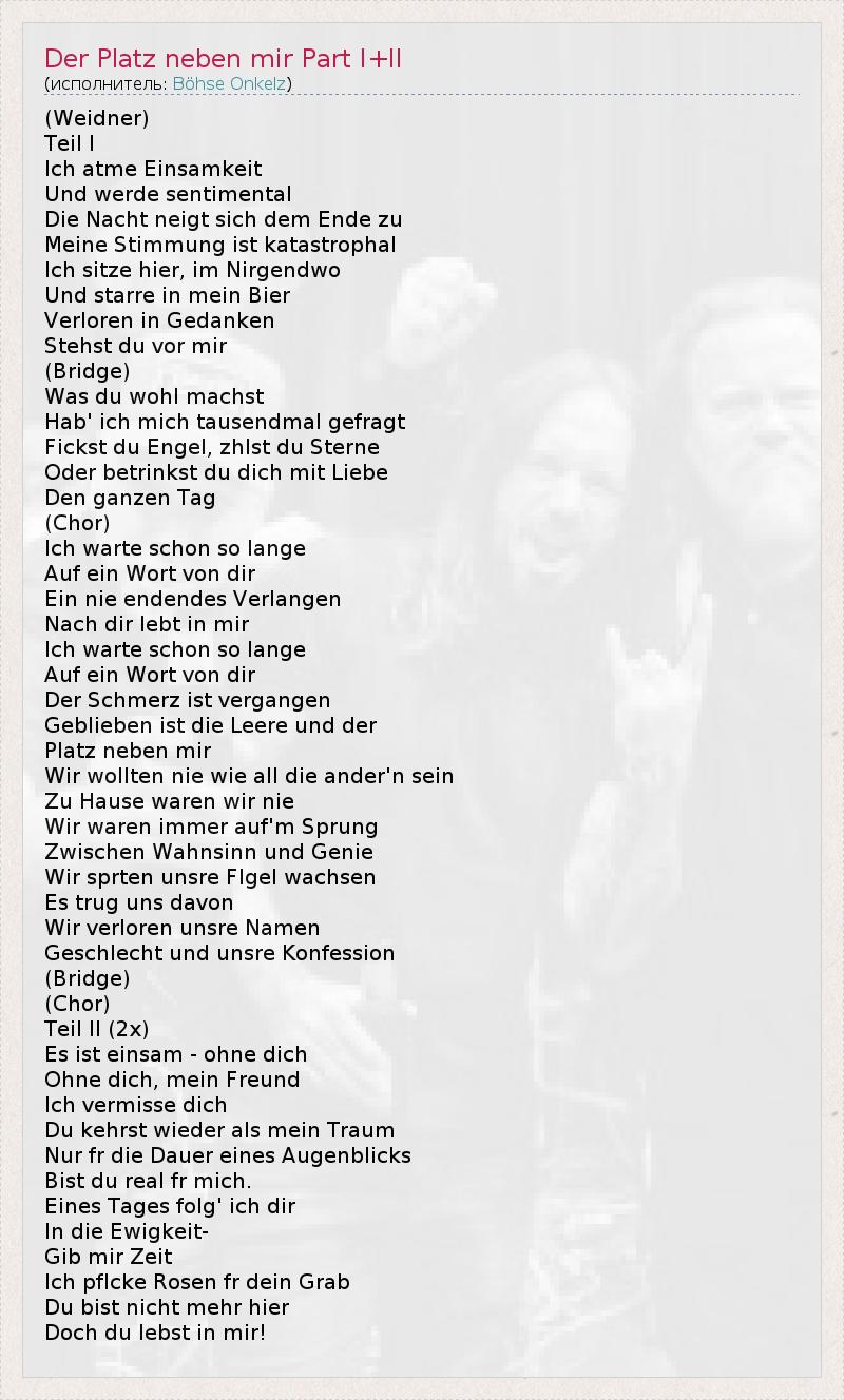 (Weidner) Teil I Ich atme Einsamkeit Und werde sentimental Die Nacht neigt sich dem Ende zu Meine Stimmung ist katastrophal Ich sitze hier, im Nirgendwo Und starre in mein Bier Verloren in Gedanken Stehst du vor mir (Bridge) Was du wohl machst Hab' ich mich tausendmal gefragt Fickst du Engel, zhlst du Sterne Oder betrinkst du dich mit Liebe Den ganzen Tag (Chor) Ich warte schon so lange Auf ein Wort von dir Ein nie endendes Verlangen Nach dir lebt in mir Ich warte schon so lange Auf ein Wort von dir Der Schmerz ist vergangen Geblieben ist die Leere und der Platz neben mir Wir wollten nie wie all die ander'n sein Zu Hause waren wir nie Wir waren immer auf'm Sprung Zwischen Wahnsinn und Genie Wir sprten unsre Flgel wachsen Es trug uns davon Wir verloren unsre Namen Geschlecht und unsre Konfession (Bridge) (Chor) Teil II (2x) Es ist einsam - ohne dich Ohne dich, mein Freund Ich vermisse dich Du kehrst wieder als mein Traum Nur fr die Dauer eines Augenblicks Bist du real fr mich. Eines Tages folg' ich dir In die Ewigkeit- Gib mir Zeit Ich pflcke Rosen fr dein Grab Du bist nicht mehr hier Doch du lebst in mir!