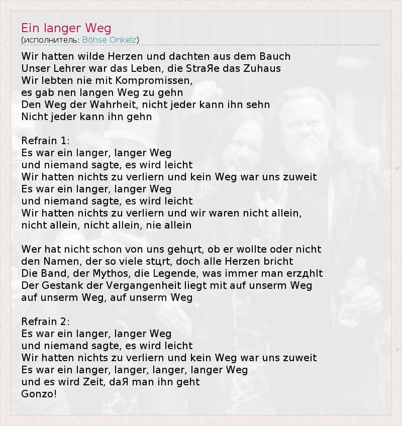 Wir hatten wilde Herzen und dachten aus dem Bauch Unser Lehrer war das Leben, die StraЯe das Zuhaus Wir lebten nie mit Kompromissen, es gab nen langen Weg zu gehn Den Weg der Wahrheit, nicht jeder kann ihn sehn Nicht jeder kann ihn gehn Refrain 1: Es war ein langer, langer Weg und niemand sagte, es wird leicht Wir hatten nichts zu verliern und kein Weg war uns zuweit Es war ein langer, langer Weg und niemand sagte, es wird leicht Wir hatten nichts zu verliern und wir waren nicht allein, nicht allein, nicht allein, nie allein Wer hat nicht schon von uns gehцrt, ob er wollte oder nicht den Namen, der so viele stцrt, doch alle Herzen bricht Die Band, der Mythos, die Legende, was immer man erzдhlt Der Gestank der Vergangenheit liegt mit auf unserm Weg auf unserm Weg, auf unserm Weg Refrain 2: Es war ein langer, langer Weg und niemand sagte, es wird leicht Wir hatten nichts zu verliern und kein Weg war uns zuweit Es war ein langer, langer, langer, langer Weg und es wird Zeit, daЯ man ihn geht Gonzo!