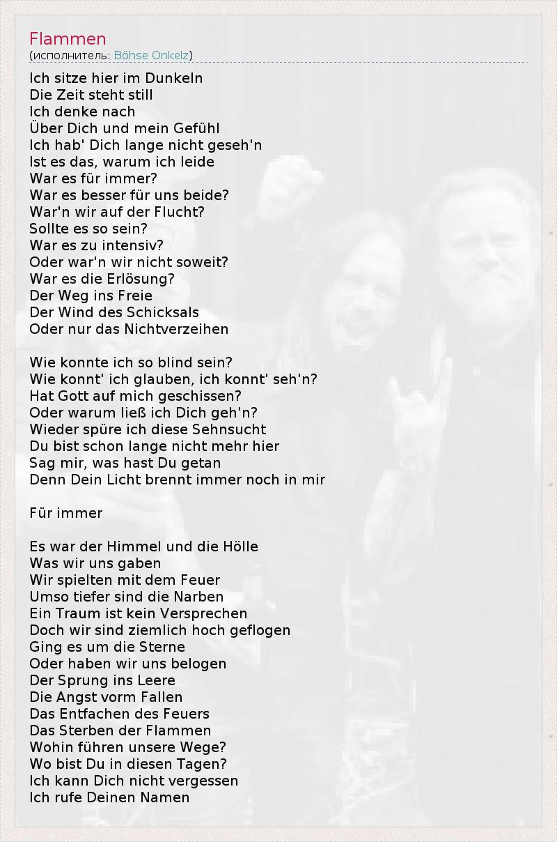 Ich sitze hier im Dunkeln Die Zeit steht still Ich denke nach Über Dich und mein Gefühl Ich hab' Dich lange nicht geseh'n Ist es das, warum ich leide War es für immer? War es besser für uns beide? War'n wir auf der Flucht? Sollte es so sein? War es zu intensiv? Oder war'n wir nicht soweit? War es die Erlösung? Der Weg ins Freie Der Wind des Schicksals Oder nur das Nichtverzeihen Wie konnte ich so blind sein? Wie konnt' ich glauben, ich konnt' seh'n? Hat Gott auf mich geschissen? Oder warum ließ ich Dich geh'n? Wieder spüre ich diese Sehnsucht Du bist schon lange nicht mehr hier Sag mir, was hast Du getan Denn Dein Licht brennt immer noch in mir Für immer Es war der Himmel und die Hölle Was wir uns gaben Wir spielten mit dem Feuer Umso tiefer sind die Narben Ein Traum ist kein Versprechen Doch wir sind ziemlich hoch geflogen Ging es um die Sterne Oder haben wir uns belogen Der Sprung ins Leere Die Angst vorm Fallen Das Entfachen des Feuers Das Sterben der Flammen Wohin führen unsere Wege? Wo bist Du in diesen Tagen? Ich kann Dich nicht vergessen Ich rufe Deinen Namen