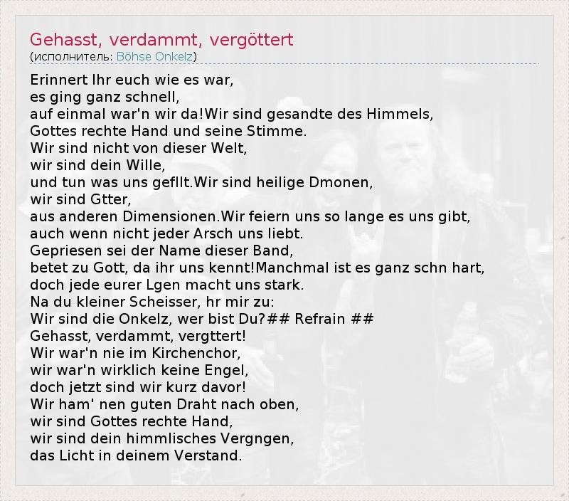 Erinnert Ihr euch wie es war, es ging ganz schnell, auf einmal war'n wir da!Wir sind gesandte des Himmels, Gottes rechte Hand und seine Stimme. Wir sind nicht von dieser Welt, wir sind dein Wille, und tun was uns gefllt.Wir sind heilige Dmonen, wir sind Gtter, aus anderen Dimensionen.Wir feiern uns so lange es uns gibt, auch wenn nicht jeder Arsch uns liebt. Gepriesen sei der Name dieser Band, betet zu Gott, da ihr uns kennt!Manchmal ist es ganz schn hart, doch jede eurer Lgen macht uns stark. Na du kleiner Scheisser, hr mir zu: Wir sind die Onkelz, wer bist Du?## Refrain ## Gehasst, verdammt, vergttert! Wir war'n nie im Kirchenchor, wir war'n wirklich keine Engel, doch jetzt sind wir kurz davor! Wir ham' nen guten Draht nach oben, wir sind Gottes rechte Hand, wir sind dein himmlisches Vergngen, das Licht in deinem Verstand.