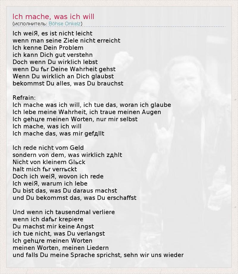 Ich weiЯ, es ist nicht leicht wenn man seine Ziele nicht erreicht Ich kenne Dein Problem ich kann Dich gut verstehn Doch wenn Du wirklich lebst wenn Du fьr Deine Wahrheit gehst Wenn Du wirklich an Dich glaubst bekommst Du alles, was Du brauchst Refrain: Ich mache was ich will, ich tue das, woran ich glaube Ich lebe meine Wahrheit, ich traue meinen Augen Ich gehцre meinen Worten, nur mir selbst Ich mache, was ich will Ich mache das, was mir gefдllt Ich rede nicht vom Geld sondern von dem, was wirklich zдhlt Nicht von kleinem Glьck halt mich fьr verrьckt Doch ich weiЯ, wovon ich rede Ich weiЯ, warum ich lebe Du bist das, was Du daraus machst und Du bekommst das, was Du erschaffst Und wenn ich tausendmal verliere wenn ich dafьr krepiere Du machst mir keine Angst ich tue nicht, was Du verlangst Ich gehцre meinen Worten meinen Worten, meinen Liedern und falls Du meine Sprache sprichst, sehn wir uns wieder