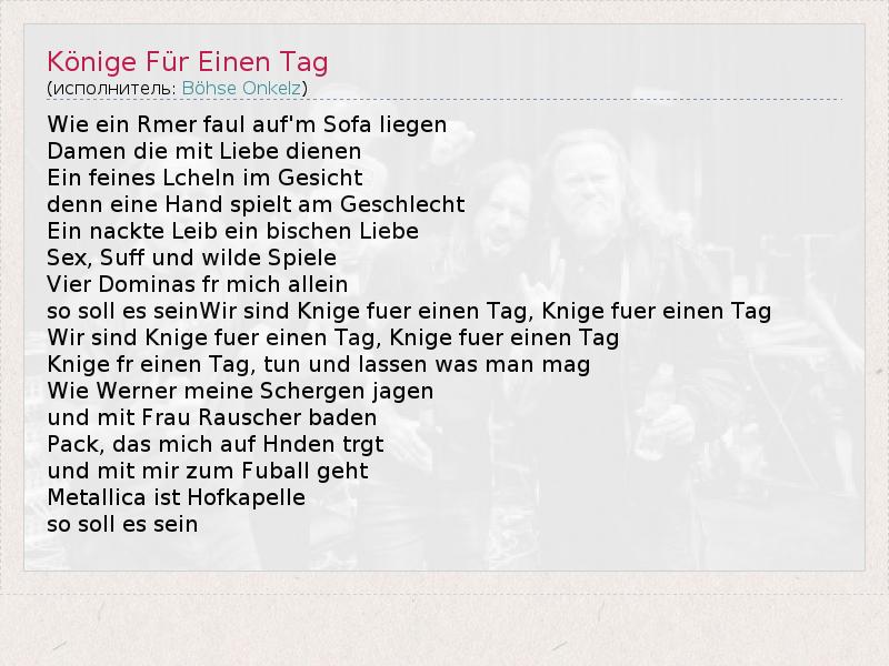 Wie ein Rmer faul auf'm Sofa liegen Damen die mit Liebe dienen Ein feines Lcheln im Gesicht denn eine Hand spielt am Geschlecht Ein nackte Leib ein bischen Liebe Sex, Suff und wilde Spiele Vier Dominas fr mich allein so soll es seinWir sind Knige fuer einen Tag, Knige fuer einen Tag Wir sind Knige fuer einen Tag, Knige fuer einen Tag Knige fr einen Tag, tun und lassen was man mag Wie Werner meine Schergen jagen und mit Frau Rauscher baden Pack, das mich auf Hnden trgt und mit mir zum Fuball geht Metallica ist Hofkapelle so soll es sein