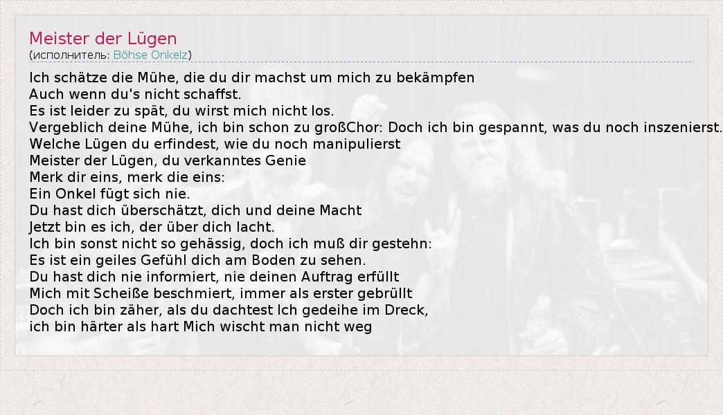Ich schätze die Mühe, die du dir machst um mich zu bekämpfen Auch wenn du's nicht schaffst. Es ist leider zu spät, du wirst mich nicht los. Vergeblich deine Mühe, ich bin schon zu großChor: Doch ich bin gespannt, was du noch inszenierst. Welche Lügen du erfindest, wie du noch manipulierst Meister der Lügen, du verkanntes Genie Merk dir eins, merk die eins: Ein Onkel fügt sich nie. Du hast dich überschätzt, dich und deine Macht Jetzt bin es ich, der über dich lacht. Ich bin sonst nicht so gehässig, doch ich muß dir gestehn: Es ist ein geiles Gefühl dich am Boden zu sehen. Du hast dich nie informiert, nie deinen Auftrag erfüllt Mich mit Scheiße beschmiert, immer als erster gebrüllt Doch ich bin zäher, als du dachtest Ich gedeihe im Dreck, ich bin härter als hart Mich wischt man nicht weg