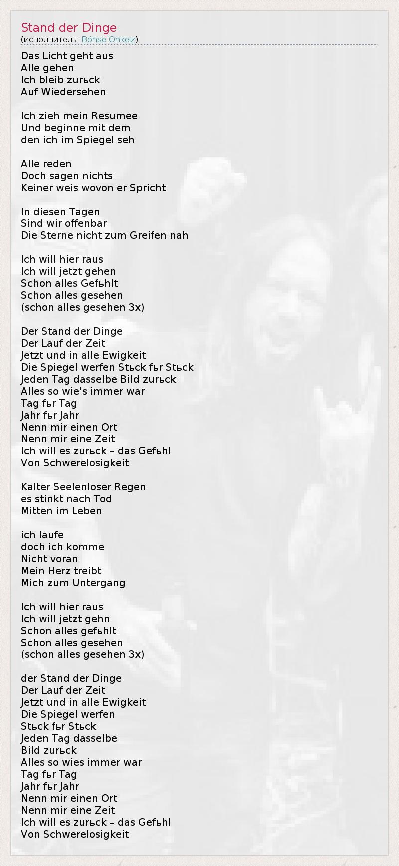 Das Licht geht aus Alle gehen Ich bleib zurьck Auf Wiedersehen Ich zieh mein Resumee Und beginne mit dem den ich im Spiegel seh Alle reden Doch sagen nichts Keiner weis wovon er Spricht In diesen Tagen Sind wir offenbar Die Sterne nicht zum Greifen nah Ich will hier raus Ich will jetzt gehen Schon alles Gefьhlt Schon alles gesehen (schon alles gesehen 3x) Der Stand der Dinge Der Lauf der Zeit Jetzt und in alle Ewigkeit Die Spiegel werfen Stьck fьr Stьck Jeden Tag dasselbe Bild zurьck Alles so wie's immer war Tag fьr Tag Jahr fьr Jahr Nenn mir einen Ort Nenn mir eine Zeit Ich will es zurьck – das Gefьhl Von Schwerelosigkeit Kalter Seelenloser Regen es stinkt nach Tod Mitten im Leben ich laufe doch ich komme Nicht voran Mein Herz treibt Mich zum Untergang Ich will hier raus Ich will jetzt gehn Schon alles gefьhlt Schon alles gesehen (schon alles gesehen 3x) der Stand der Dinge Der Lauf der Zeit Jetzt und in alle Ewigkeit Die Spiegel werfen Stьck fьr Stьck Jeden Tag dasselbe Bild zurьck Alles so wies immer war Tag fьr Tag Jahr fьr Jahr Nenn mir einen Ort Nenn mir eine Zeit Ich will es zurьck – das Gefьhl Von Schwerelosigkeit