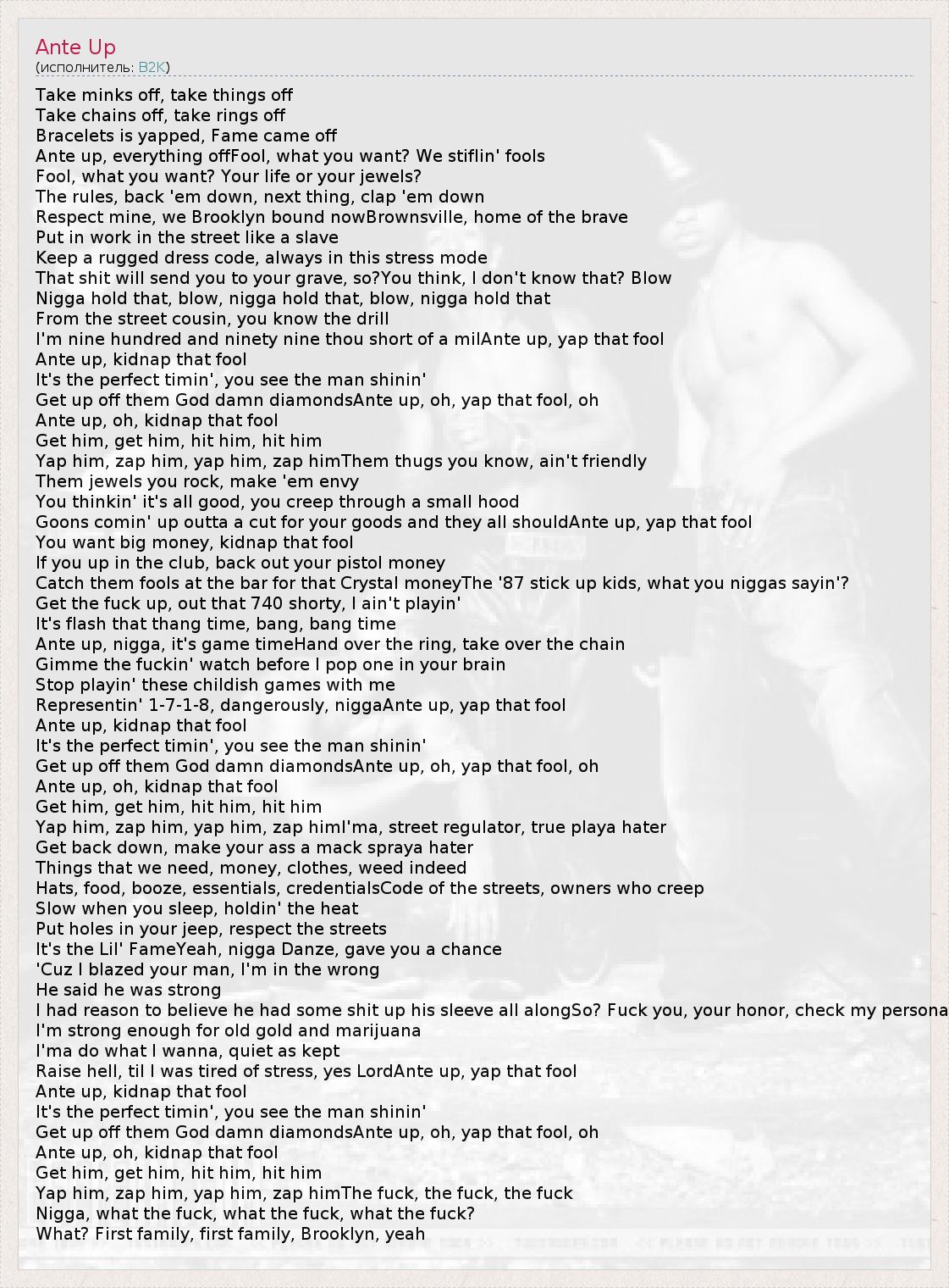 Goons comin' up outta a cut for your goods and they all shouldAnte up, yap that fool