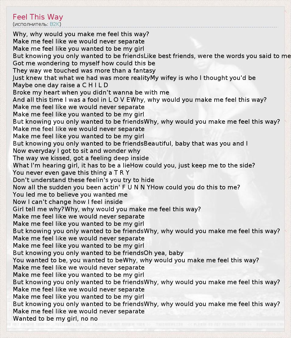 Why, why would you make me feel this way? Make me feel like we would never separate Make me feel like you wanted to be my girl But knowing you only wanted to be friendsLike best friends, were the words you said to me Got me wondering to myself how could this be They way we touched was more than a fantasy Just knew that what we had was more realityMy wifey is who I thought you'd be Maybe one day raise a C H I L D Broke my heart when you didn't wanna be with me And all this time I was a fool in L O V EWhy, why would you make me feel this way? Make me feel like we would never separate Make me feel like you wanted to be my girl But knowing you only wanted to be friendsWhy, why would you make me feel this way? Make me feel like we would never separate Make me feel like you wanted to be my girl But knowing you only wanted to be friendsBeautiful, baby that was you and I Now everyday I got to sit and wonder why The way we kissed, got a feeling deep inside What I'm hearing girl, it has to be a lieHow could you, just keep me to the side? You never even gave this thing a T R Y Don't understand these feelin's you try to hide Now all the sudden you been actin' F U N N YHow could you do this to me? You led me to believe you wanted me Now I can't change how I feel inside Girl tell me why?Why, why would you make me feel this way? Make me feel like we would never separate Make me feel like you wanted to be my girl But knowing you only wanted to be friendsWhy, why would you make me feel this way? Make me feel like we would never separate Make me feel like you wanted to be my girl But knowing you only wanted to be friendsOh yea, baby You wanted to be, you wanted to beWhy, why would you make me feel this way? Make me feel like we would never separate Make me feel like you wanted to be my girl But knowing you only wanted to be friendsWhy, why would you make me feel this way? Make me feel like we would never separate Make me feel like you wanted to be my girl But knowing you only wanted to be friendsWhy, why would you make me feel this way? Make me feel like we would never separate Wanted to be my girl, no no