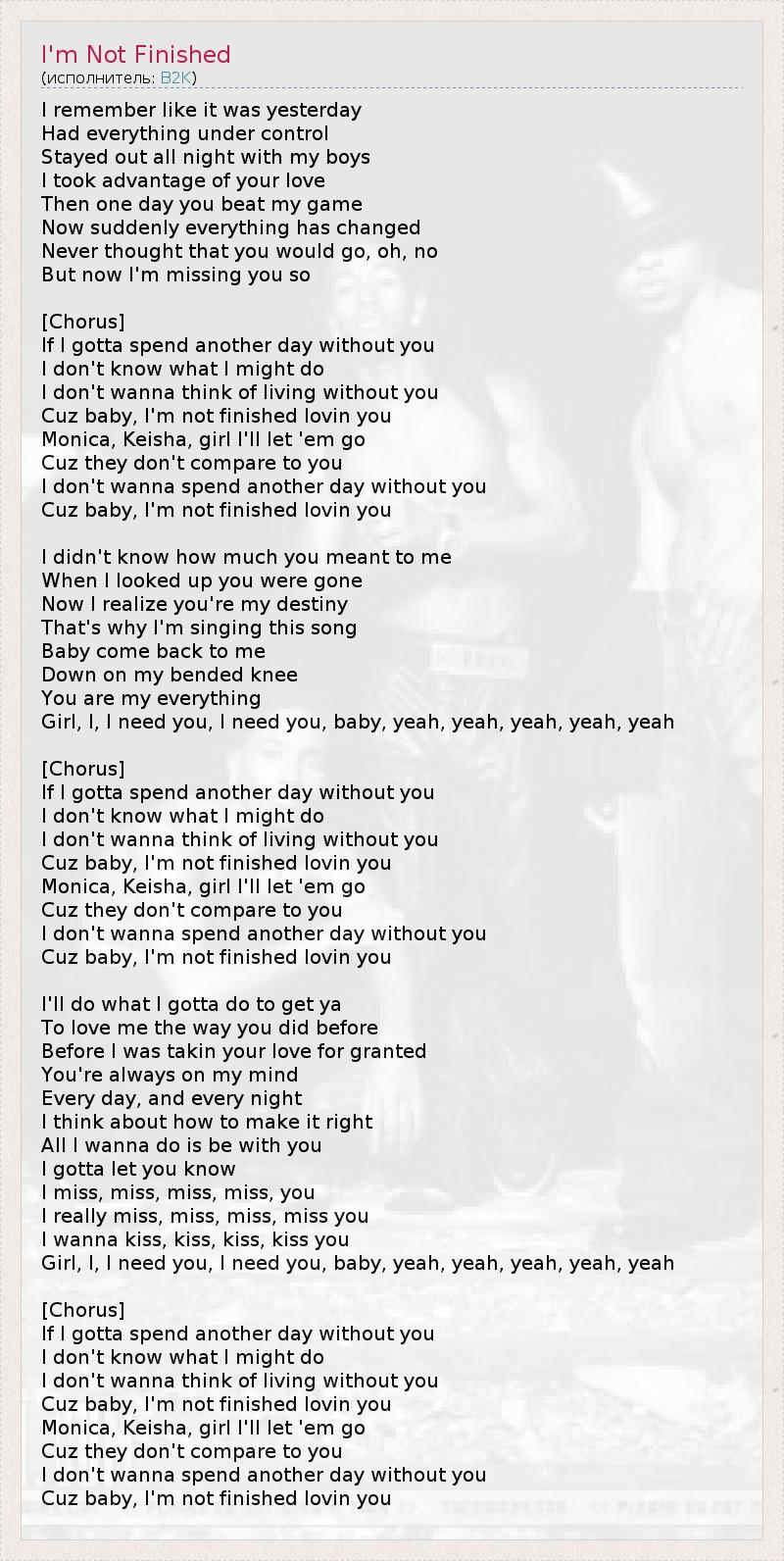 I remember like it was yesterday Had everything under control Stayed out all night with my boys I took advantage of your love Then one day you beat my game Now suddenly everything has changed Never thought that you would go, oh, no But now I'm missing you so [Chorus] If I gotta spend another day without you I don't know what I might do I don't wanna think of living without you Cuz baby, I'm not finished lovin you Monica, Keisha, girl I'll let 'em go Cuz they don't compare to you I don't wanna spend another day without you Cuz baby, I'm not finished lovin you I didn't know how much you meant to me When I looked up you were gone Now I realize you're my destiny That's why I'm singing this song Baby come back to me Down on my bended knee You are my everything Girl, I, I need you, I need you, baby, yeah, yeah, yeah, yeah, yeah [Chorus] If I gotta spend another day without you I don't know what I might do I don't wanna think of living without you Cuz baby, I'm not finished lovin you Monica, Keisha, girl I'll let 'em go Cuz they don't compare to you I don't wanna spend another day without you Cuz baby, I'm not finished lovin you I'll do what I gotta do to get ya To love me the way you did before Before I was takin your love for granted You're always on my mind Every day, and every night I think about how to make it right All I wanna do is be with you I gotta let you know I miss, miss, miss, miss, you I really miss, miss, miss, miss you I wanna kiss, kiss, kiss, kiss you Girl, I, I need you, I need you, baby, yeah, yeah, yeah, yeah, yeah [Chorus] If I gotta spend another day without you I don't know what I might do I don't wanna think of living without you Cuz baby, I'm not finished lovin you Monica, Keisha, girl I'll let 'em go Cuz they don't compare to you I don't wanna spend another day without you Cuz baby, I'm not finished lovin you