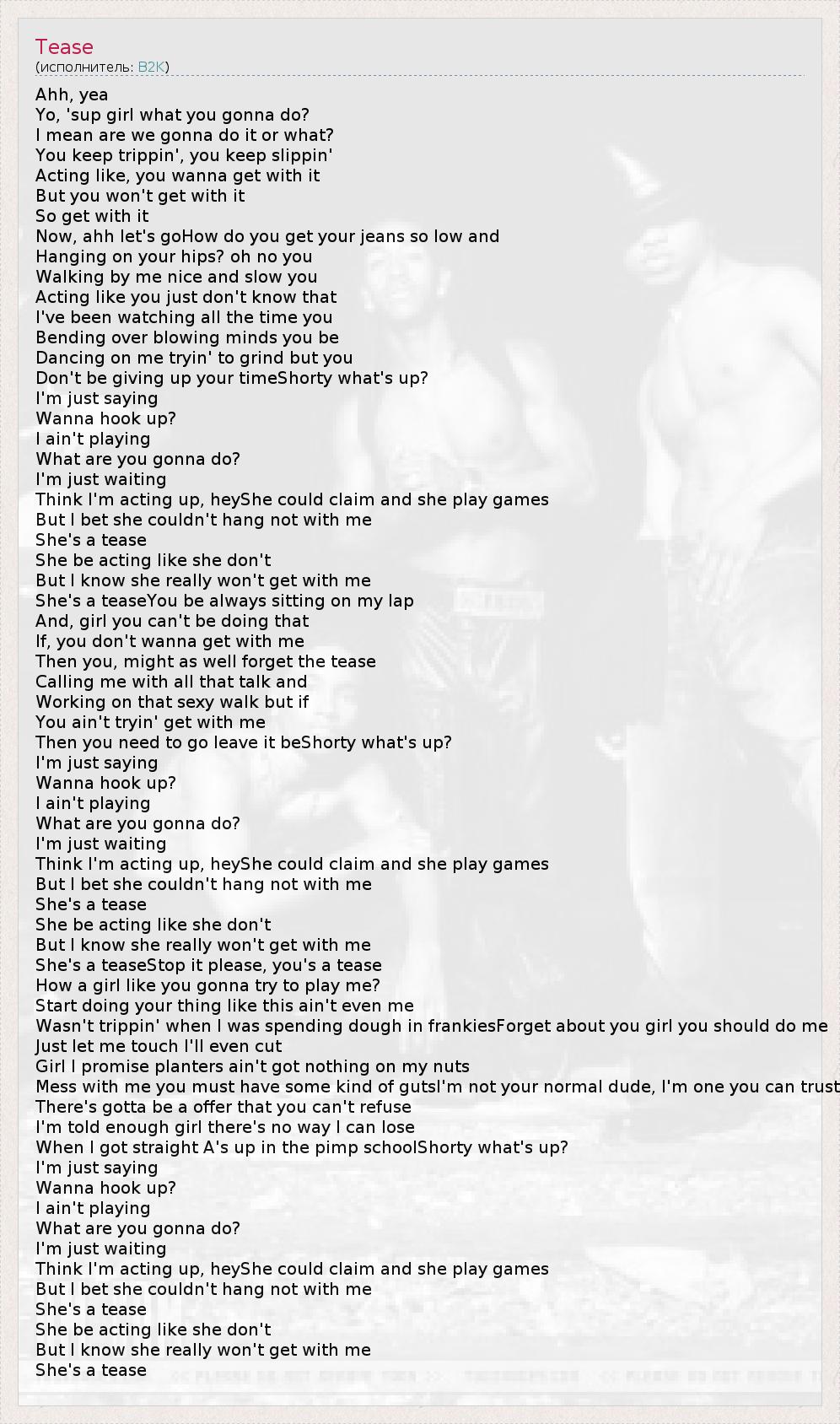 Это интересно:Подростковая R&B группа B2K появилась на музыкальном рынке США в 2002 году с одноименным дебютным альбомом. В состав коллектива входили четыре участника: Omarion, Raz-B, Lil' Fizz и J-Boog, причем, возраст ни одного из ребят на тот момент не превышал 18 лет. Группу заметили на конкурсе талантов Epic Records Talent Search.Год спустя B2K начали работать над саундтрэком к фильму “You Got Served”, в котором участники группы... продолжение