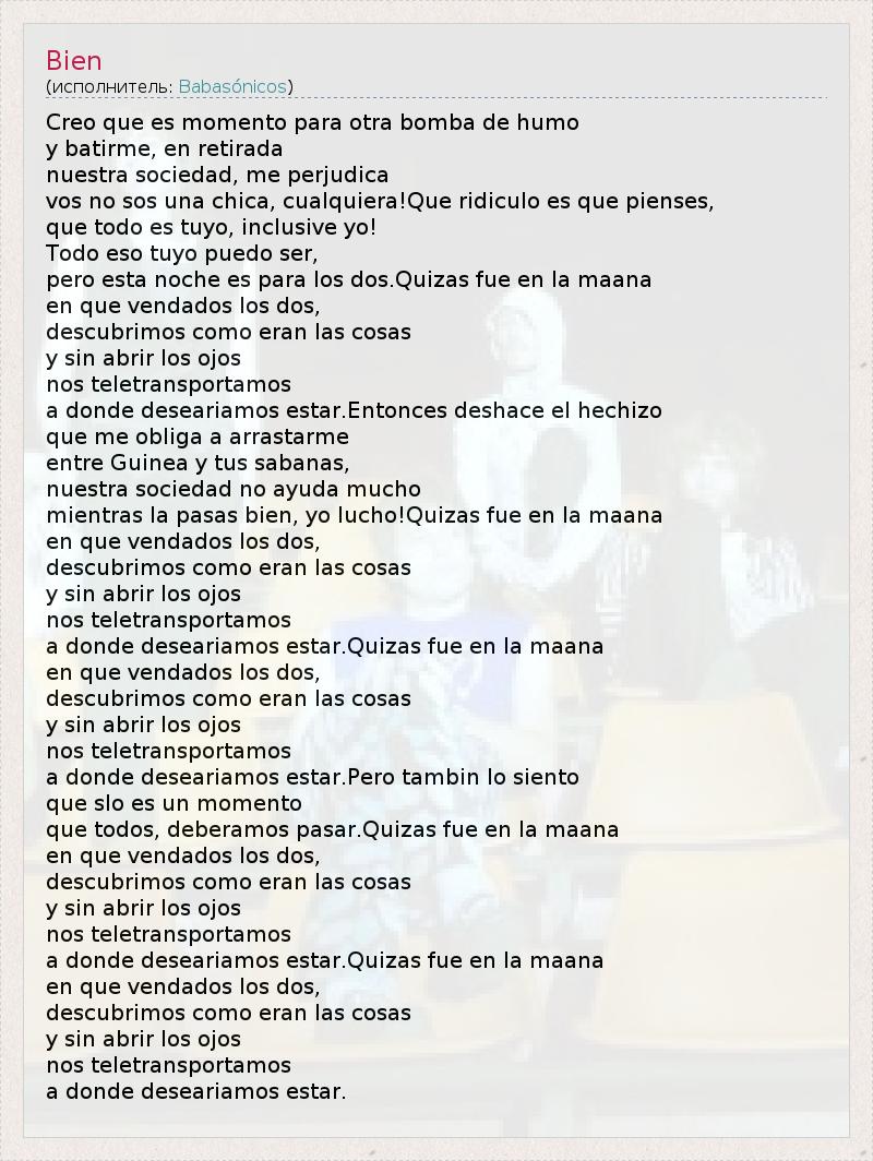 Creo que es momento para otra bomba de humo y batirme, en retirada nuestra sociedad, me perjudica vos no sos una chica, cualquiera!Que ridiculo es que pienses, que todo es tuyo, inclusive yo! Todo eso tuyo puedo ser, pero esta noche es para los dos.Quizas fue en la maana en que vendados los dos, descubrimos como eran las cosas y sin abrir los ojos nos teletransportamos a donde deseariamos estar.Entonces deshace el hechizo que me obliga a arrastarme entre Guinea y tus sabanas, nuestra sociedad no ayuda mucho mientras la pasas bien, yo lucho!Quizas fue en la maana en que vendados los dos, descubrimos como eran las cosas y sin abrir los ojos nos teletransportamos a donde deseariamos estar.Quizas fue en la maana en que vendados los dos, descubrimos como eran las cosas y sin abrir los ojos nos teletransportamos a donde deseariamos estar.Pero tambin lo siento que slo es un momento que todos, deberamos pasar.Quizas fue en la maana en que vendados los dos, descubrimos como eran las cosas y sin abrir los ojos nos teletransportamos a donde deseariamos estar.Quizas fue en la maana en que vendados los dos, descubrimos como eran las cosas y sin abrir los ojos nos teletransportamos a donde deseariamos estar.