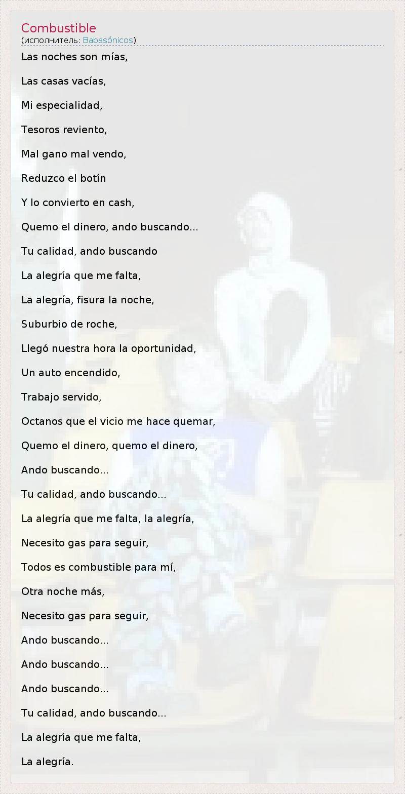 Это интересно:Babasónicos - аргентинская рок-группа, образованная в начале 1990-ых. Cтала одной из основных андерграунд-команд конца 90-ых.Название является синтезом от "Sai Baba" (индийский гуру) и от "The Jetsons" (по-испански - "Los Supersónicos").Лид-вокалист Adrián "Dárgelos" Rodríguez и клавишник Diego "Uma-T" Tuñón изначально решили играть в стиле "новой волны" (так называемый new wave), совершенно... продолжение