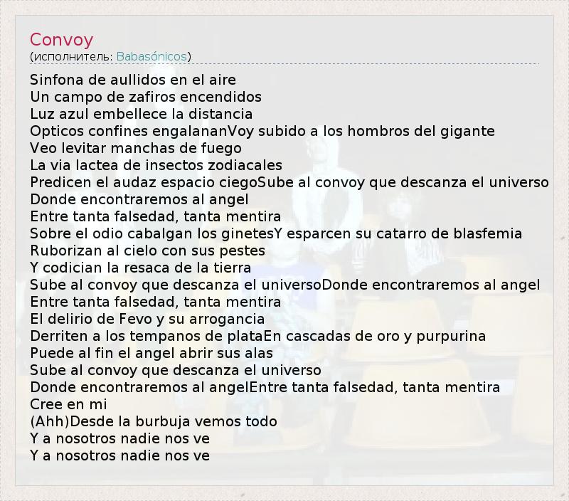 Sinfona de aullidos en el aire Un campo de zafiros encendidos Luz azul embellece la distancia Opticos confines engalananVoy subido a los hombros del gigante Veo levitar manchas de fuego La via lactea de insectos zodiacales Predicen el audaz espacio ciegoSube al convoy que descanza el universo Donde encontraremos al angel Entre tanta falsedad, tanta mentira Sobre el odio cabalgan los ginetesY esparcen su catarro de blasfemia Ruborizan al cielo con sus pestes Y codician la resaca de la tierra Sube al convoy que descanza el universoDonde encontraremos al angel Entre tanta falsedad, tanta mentira El delirio de Fevo y su arrogancia Derriten a los tempanos de plataEn cascadas de oro y purpurina Puede al fin el angel abrir sus alas Sube al convoy que descanza el universo Donde encontraremos al angelEntre tanta falsedad, tanta mentira Cree en mi (Ahh)Desde la burbuja vemos todo Y a nosotros nadie nos ve Y a nosotros nadie nos ve