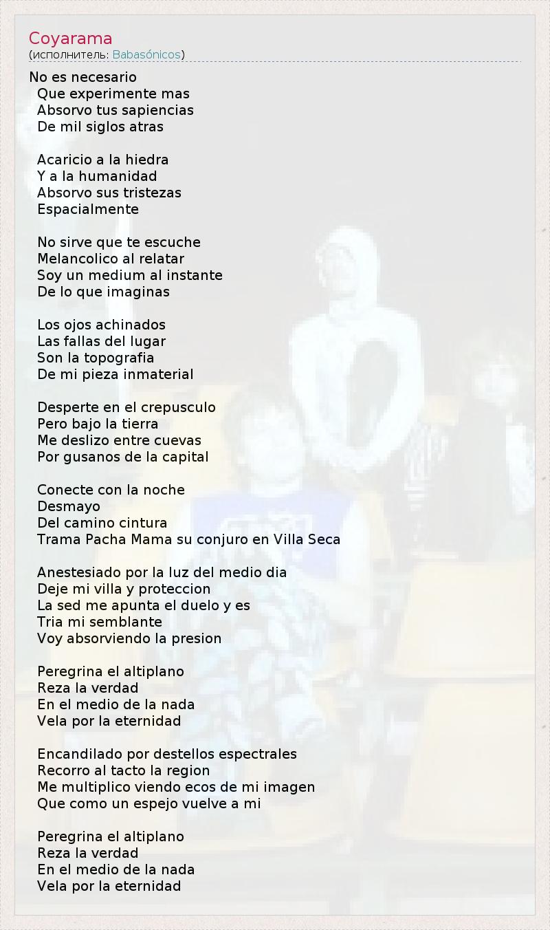 Это интересно:Babasónicos - аргентинская рок-группа, образованная в начале 1990-ых. Cтала одной из основных андерграунд-команд конца 90-ых.Название является синтезом от "Sai Baba" (индийский гуру) и от "The Jetsons" (по-испански - "Los Supersónicos").Лид-вокалист Adrián "Dárgelos" Rodríguez и клавишник Diego "Uma-T" Tuñón изначально решили играть в стиле "новой волны" (так называемый new wave), совершенно... продолжение