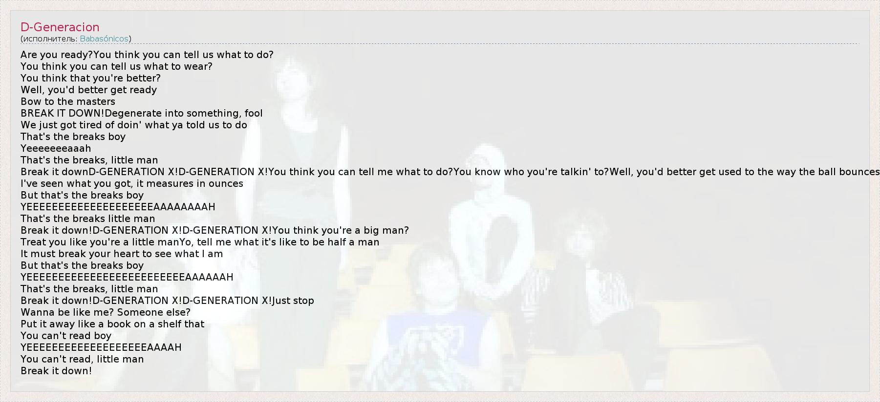 Are you ready?You think you can tell us what to do? You think you can tell us what to wear? You think that you're better? Well, you'd better get ready Bow to the masters BREAK IT DOWN!Degenerate into something, fool We just got tired of doin' what ya told us to do That's the breaks boy Yeeeeeeeaaah That's the breaks, little man Break it downD-GENERATION X!D-GENERATION X!You think you can tell me what to do?You know who you're talkin' to?Well, you'd better get used to the way the ball bounces I've seen what you got, it measures in ounces But that's the breaks boy YEEEEEEEEEEEEEEEEEEEEAAAAAAAAH That's the breaks little man Break it down!D-GENERATION X!D-GENERATION X!You think you're a big man? Treat you like you're a little manYo, tell me what it's like to be half a man It must break your heart to see what I am But that's the breaks boy YEEEEEEEEEEEEEEEEEEEEEEEEEAAAAAAH That's the breaks, little man Break it down!D-GENERATION X!D-GENERATION X!Just stop Wanna be like me? Someone else? Put it away like a book on a shelf that You can't read boy YEEEEEEEEEEEEEEEEEEEAAAAH You can't read, little man Break it down!