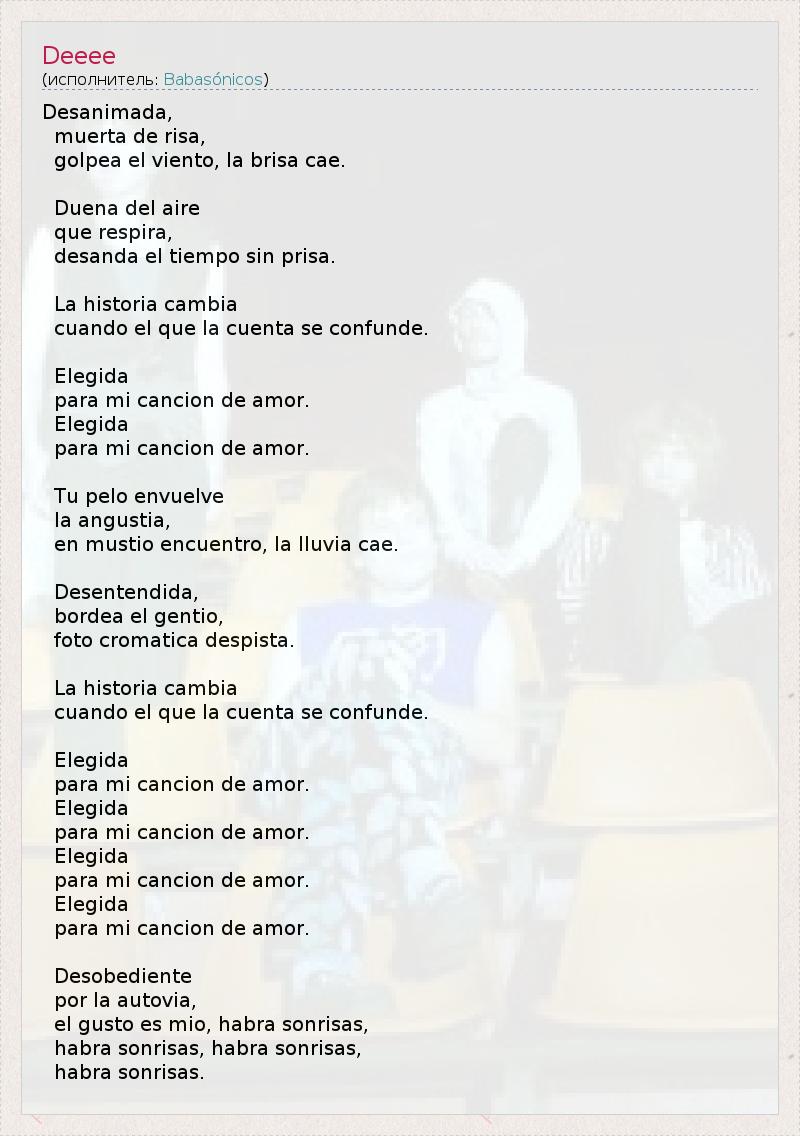 Desanimada, muerta de risa, golpea el viento, la brisa cae. Duena del aire que respira, desanda el tiempo sin prisa. La historia cambia cuando el que la cuenta se confunde. Elegida para mi cancion de amor. Elegida para mi cancion de amor. Tu pelo envuelve la angustia, en mustio encuentro, la lluvia cae. Desentendida, bordea el gentio, foto cromatica despista. La historia cambia cuando el que la cuenta se confunde. Elegida para mi cancion de amor. Elegida para mi cancion de amor. Elegida para mi cancion de amor. Elegida para mi cancion de amor. Desobediente por la autovia, el gusto es mio, habra sonrisas, habra sonrisas, habra sonrisas, habra sonrisas.