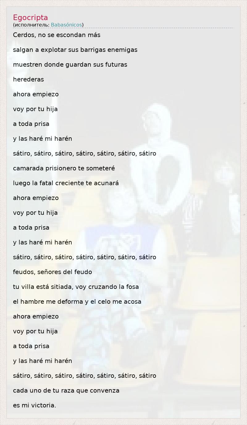 Это интересно:Babasónicos - аргентинская рок-группа, образованная в начале 1990-ых. Cтала одной из основных андерграунд-команд конца 90-ых.Название является синтезом от "Sai Baba" (индийский гуру) и от "The Jetsons" (по-испански - "Los Supersónicos").Лид-вокалист Adrián "Dárgelos" Rodríguez и клавишник Diego "Uma-T" Tuñón изначально решили играть в стиле "новой волны" (так называемый new wave), совершенно... продолжение