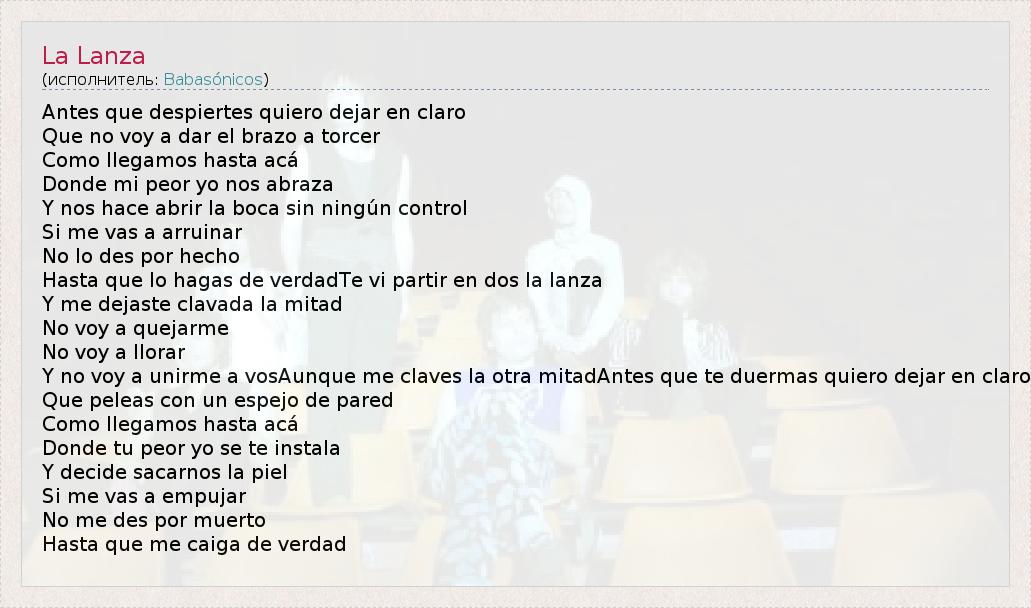 Это интересно:Babasónicos - аргентинская рок-группа, образованная в начале 1990-ых. Cтала одной из основных андерграунд-команд конца 90-ых.Название является синтезом от "Sai Baba" (индийский гуру) и от "The Jetsons" (по-испански - "Los Supersónicos").Лид-вокалист Adrián "Dárgelos" Rodríguez и клавишник Diego "Uma-T" Tuñón изначально решили играть в стиле "новой волны" (так называемый new wave), совершенно... продолжение