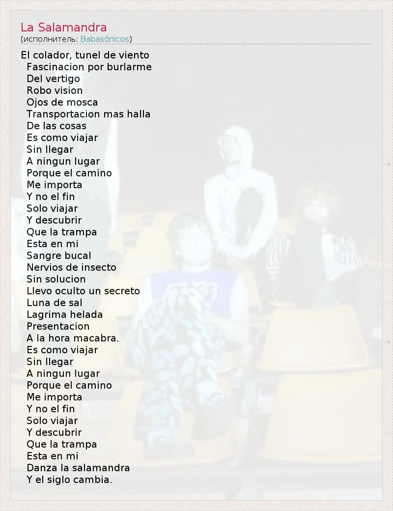 El colador, tunel de viento Fascinacion por burlarme Del vertigo Robo vision Ojos de mosca Transportacion mas halla De las cosas Es como viajar Sin llegar A ningun lugar Porque el camino Me importa Y no el fin Solo viajar Y descubrir Que la trampa Esta en mi Sangre bucal Nervios de insecto Sin solucion Llevo oculto un secreto Luna de sal Lagrima helada Presentacion A la hora macabra. Es como viajar Sin llegar A ningun lugar Porque el camino Me importa Y no el fin Solo viajar Y descubrir Que la trampa Esta en mi Danza la salamandra Y el siglo cambia.