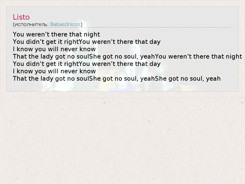 You weren't there that night You didn't get it rightYou weren't there that day I know you will never know That the lady got no soulShe got no soul, yeahYou weren't there that night You didn't get it rightYou weren't there that day I know you will never know That the lady got no soulShe got no soul, yeahShe got no soul, yeah