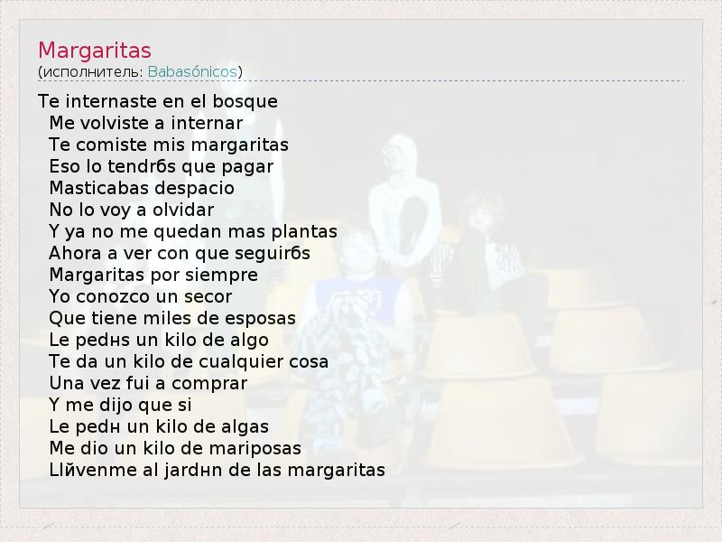 Te internaste en el bosque Me volviste a internar Te comiste mis margaritas Eso lo tendrбs que pagar Masticabas despacio No lo voy a olvidar Y ya no me quedan mas plantas Ahora a ver con que seguirбs Margaritas por siempre Yo conozco un seсor Que tiene miles de esposas Le pedнs un kilo de algo Te da un kilo de cualquier cosa Una vez fui a comprar Y me dijo que si Le pedн un kilo de algas Me dio un kilo de mariposas Llйvenme al jardнn de las margaritas
