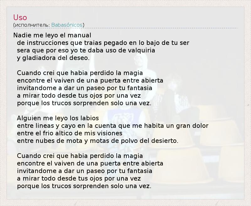 Это интересно:Babasónicos - аргентинская рок-группа, образованная в начале 1990-ых. Cтала одной из основных андерграунд-команд конца 90-ых.Название является синтезом от "Sai Baba" (индийский гуру) и от "The Jetsons" (по-испански - "Los Supersónicos").Лид-вокалист Adrián "Dárgelos" Rodríguez и клавишник Diego "Uma-T" Tuñón изначально решили играть в стиле "новой волны" (так называемый new wave), совершенно... продолжение